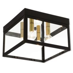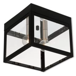 The Nyack Outdoor Ceiling Flush Light has a dramatically simple shape with bold lines, perfect for any exterior space. Features clear glass and a black with nickel lamp holders, antique brass, bronze with brass lamp holders, Satin Brass, or brushed nickel finish. Available in two sizes. Damp location rated. UL listed.