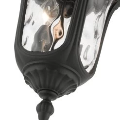 Add a traditional touch to your outdoor space with this Oxford Outdoor Ceiling Light Fixture. Made of cast aluminum with a textured black finish, this flush mount features an antique lantern-style design with ornamental details and wavy water glass. It is suitable for covered outdoor spaces.