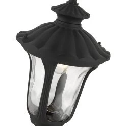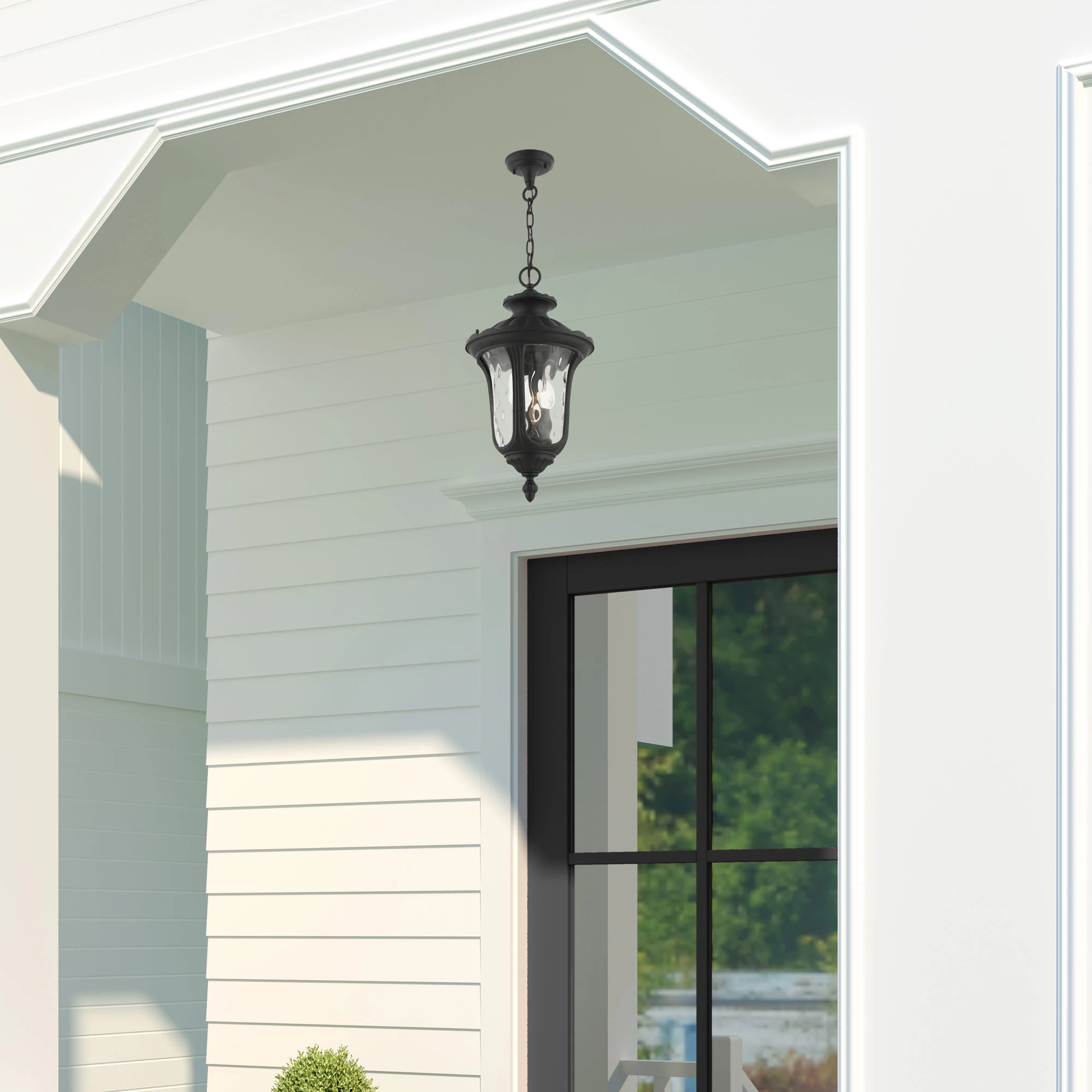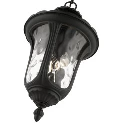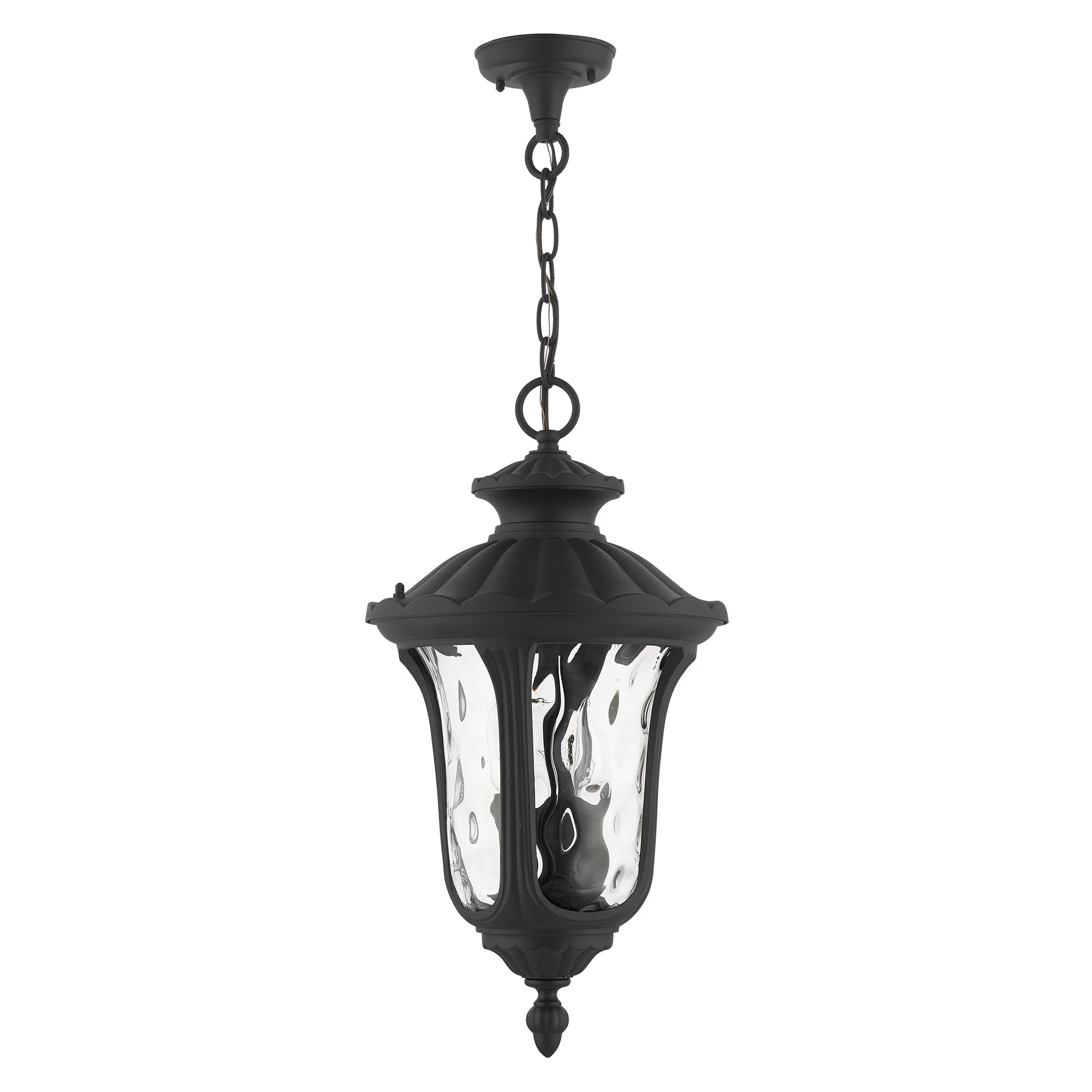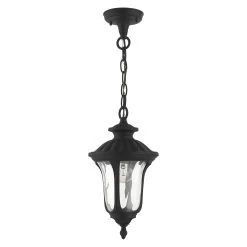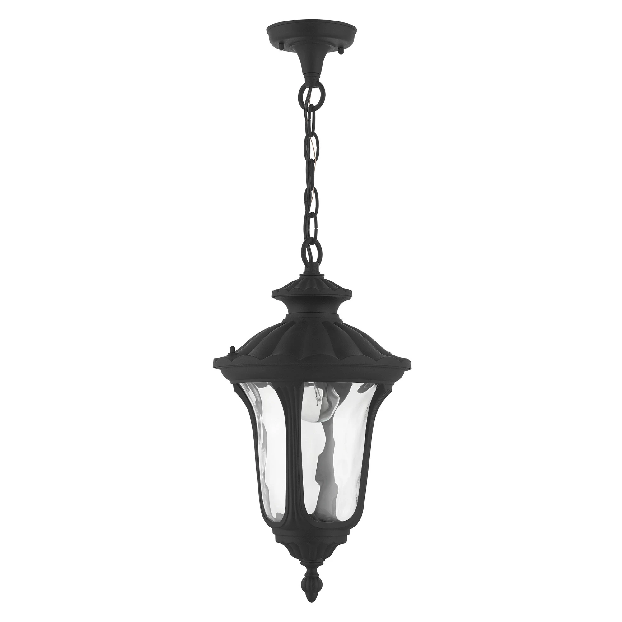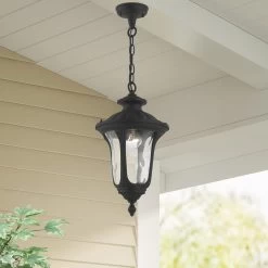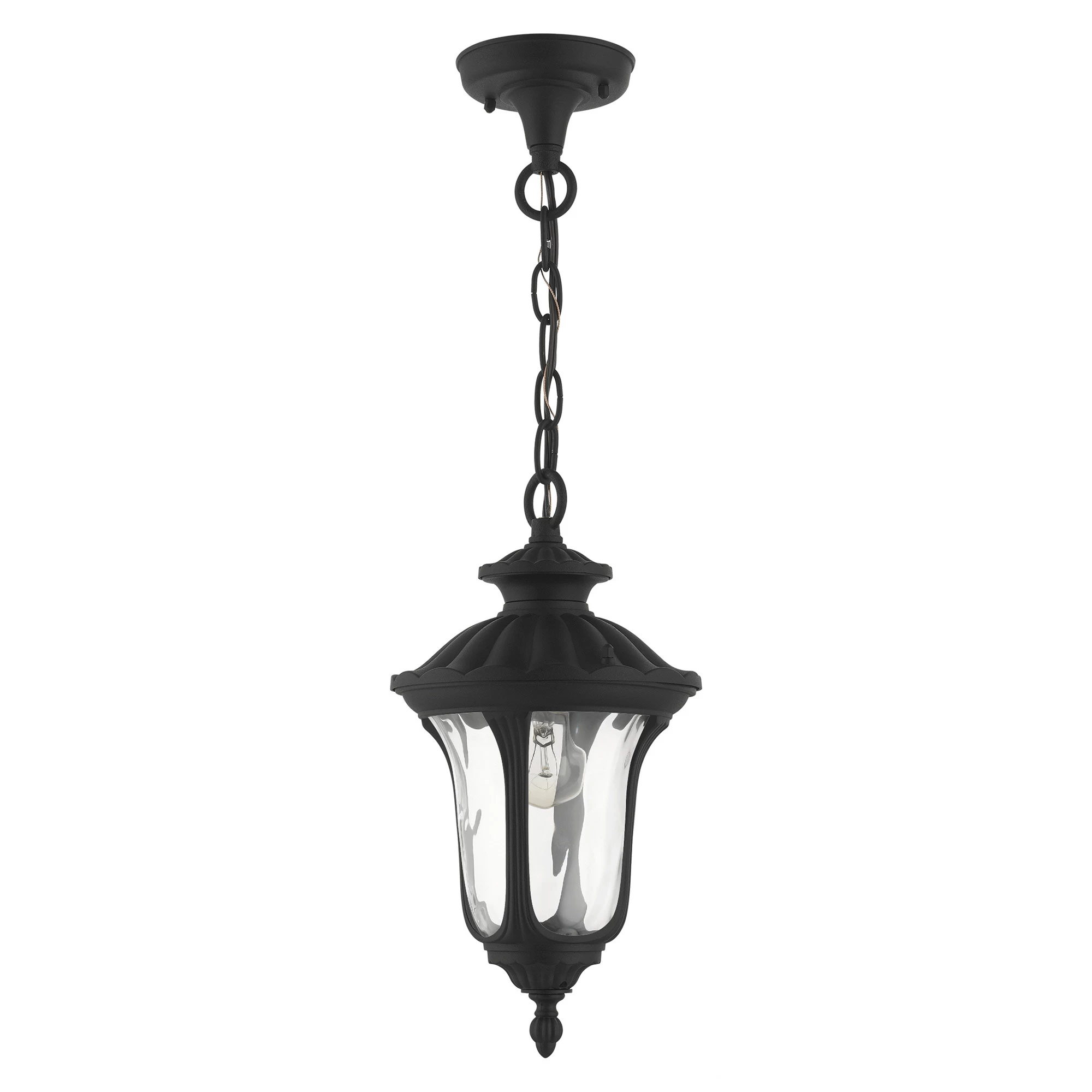 Introduce vintage charm into your outdoor space with this Oxford Pendant which features an antique-style lantern design and clear, textured water glass. Suitable for covered outdoor spaces.