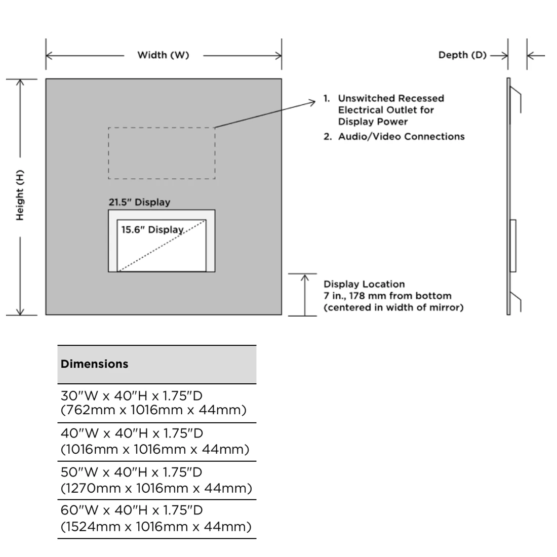 Note: The Loft TV mirror must be installed in the W x H (width x height) orientation as listed; it cannot be installed in any other direction.