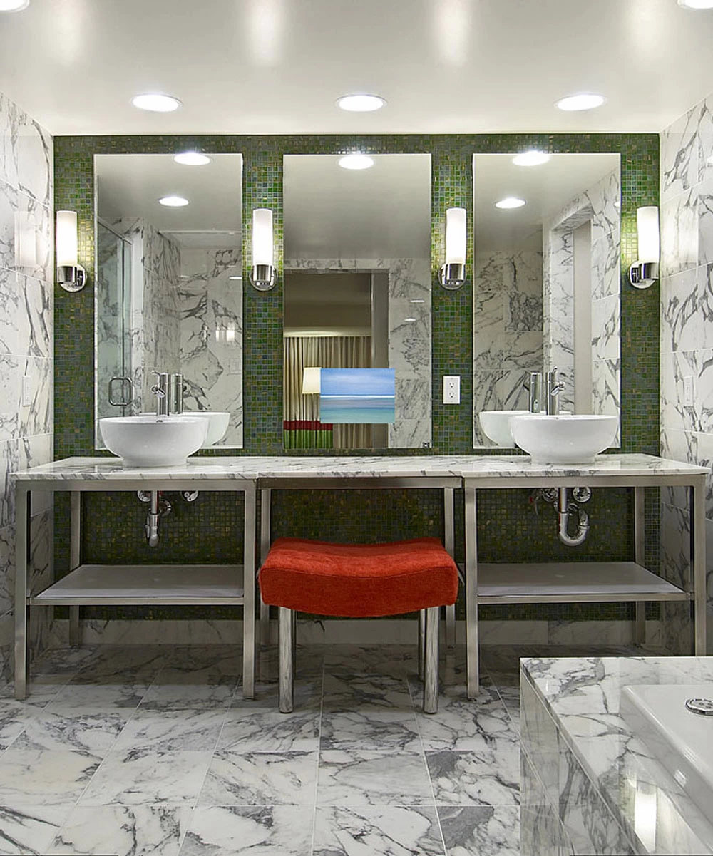 The Loft Mirror with 15 inch TV features a corrosion resistant OmegaMirror glass. Choice of a 21.5 or 15.6 inch LED HDTV with HDMI, RF and component connections. Integrated speakers for high quality stereo sound. Electric Mirror’s Spectrum Mirror TVs are best suited for bathrooms that are not overly bright. When the TV is off, the screen area is camouflaged, leaving only a light gray image where the TV is located. Waterproof remote included. Available in four sizes.