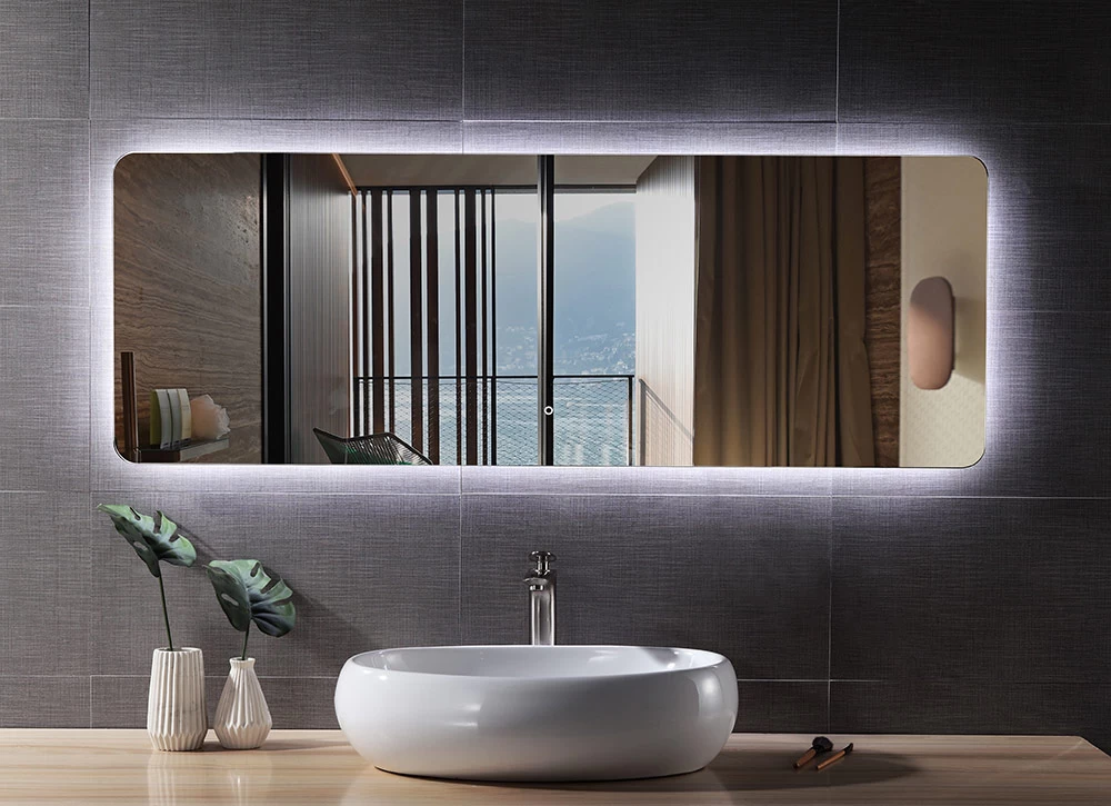 The Long Rectangle Mirror with Back light features a seamless design with a round mirror that sits away from the wall and gives off light from behind the glass. ETL listed, damp locations. Title 24 compliant.