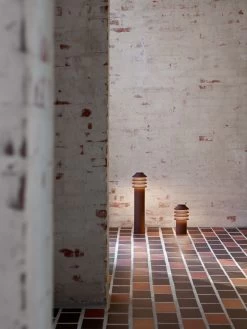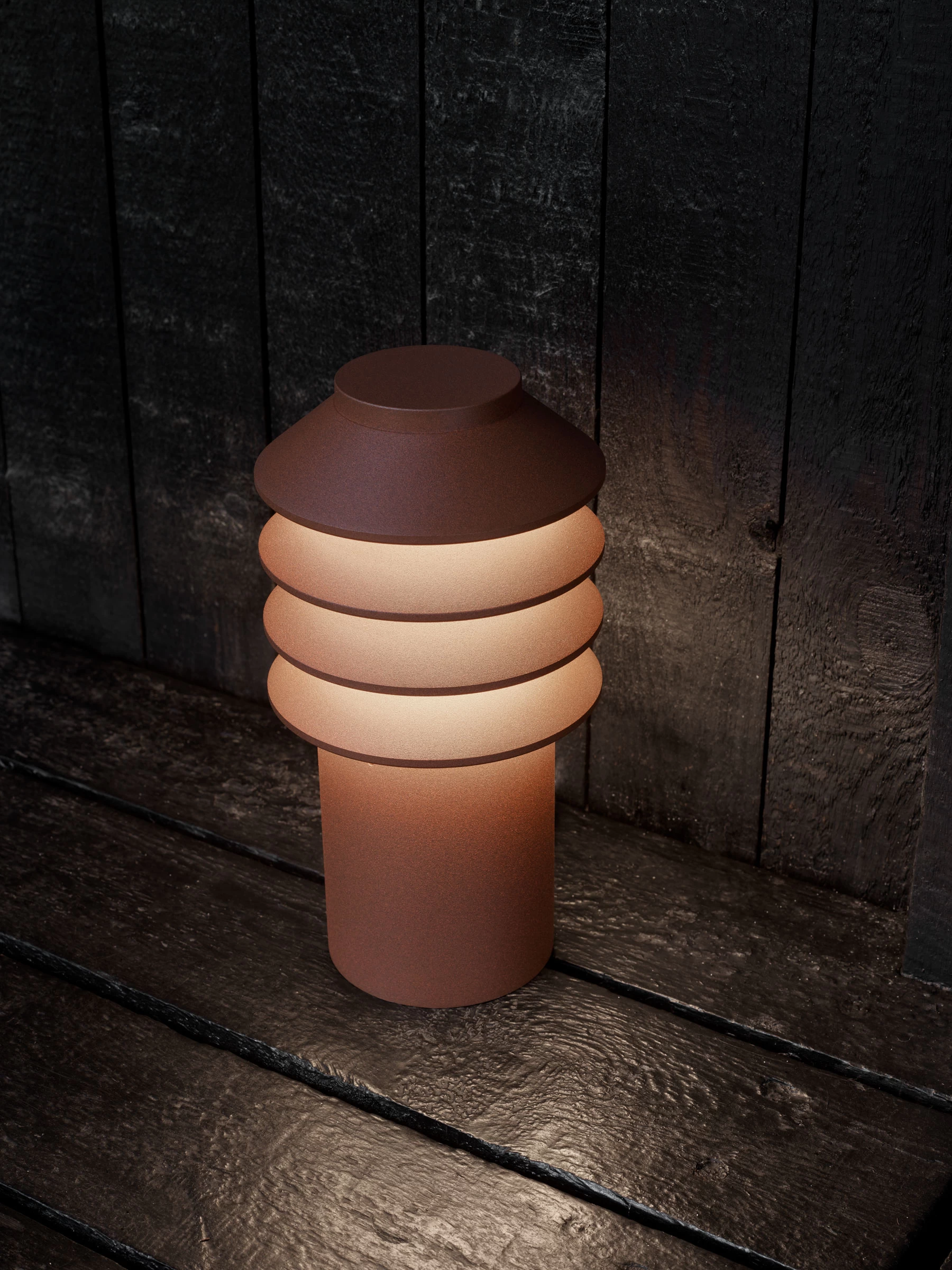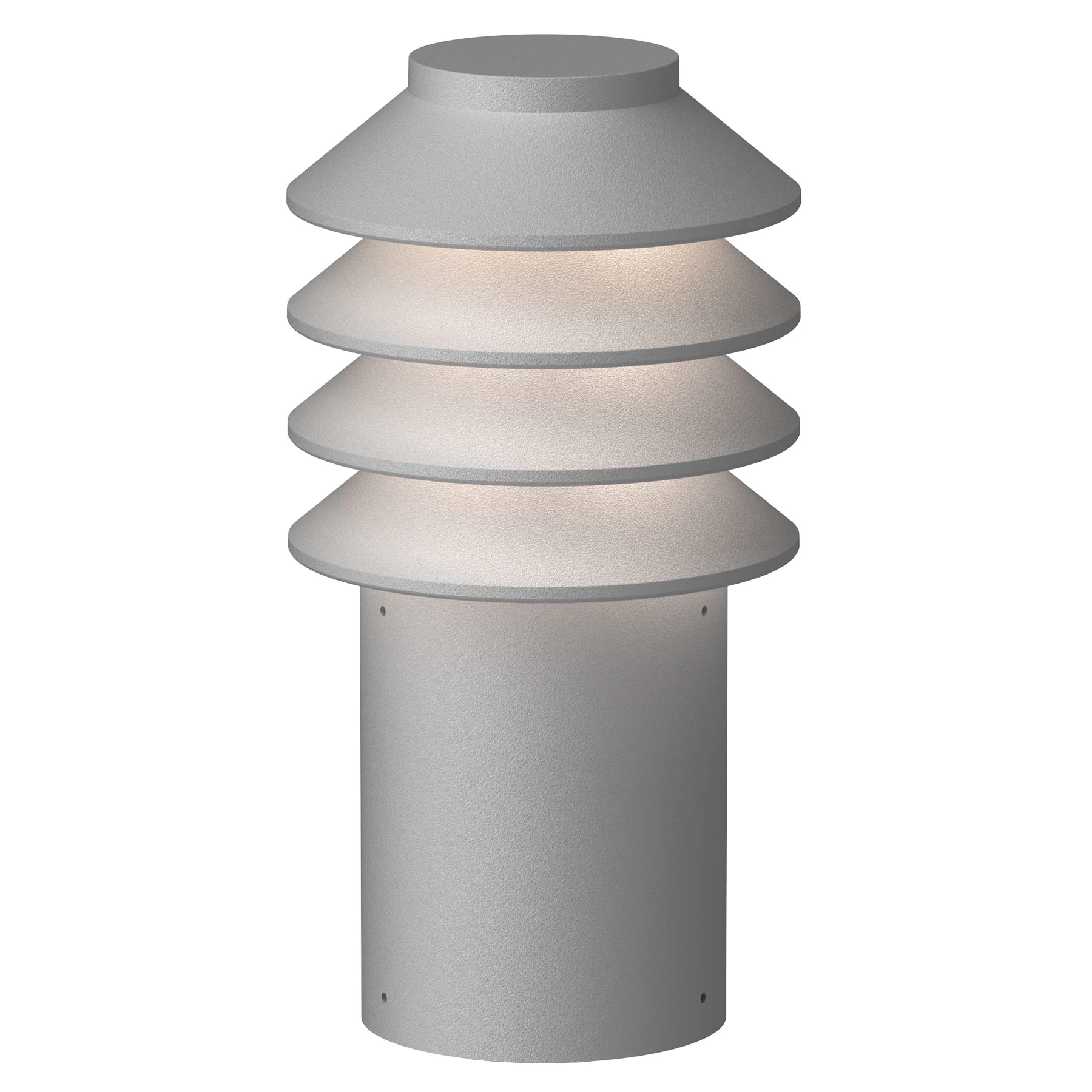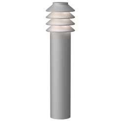 The Bysted Outdoor Bollard features a symmetrical design with four rings to softly reflect light downwards. The underside of each ring is painted white for optimal reflection.