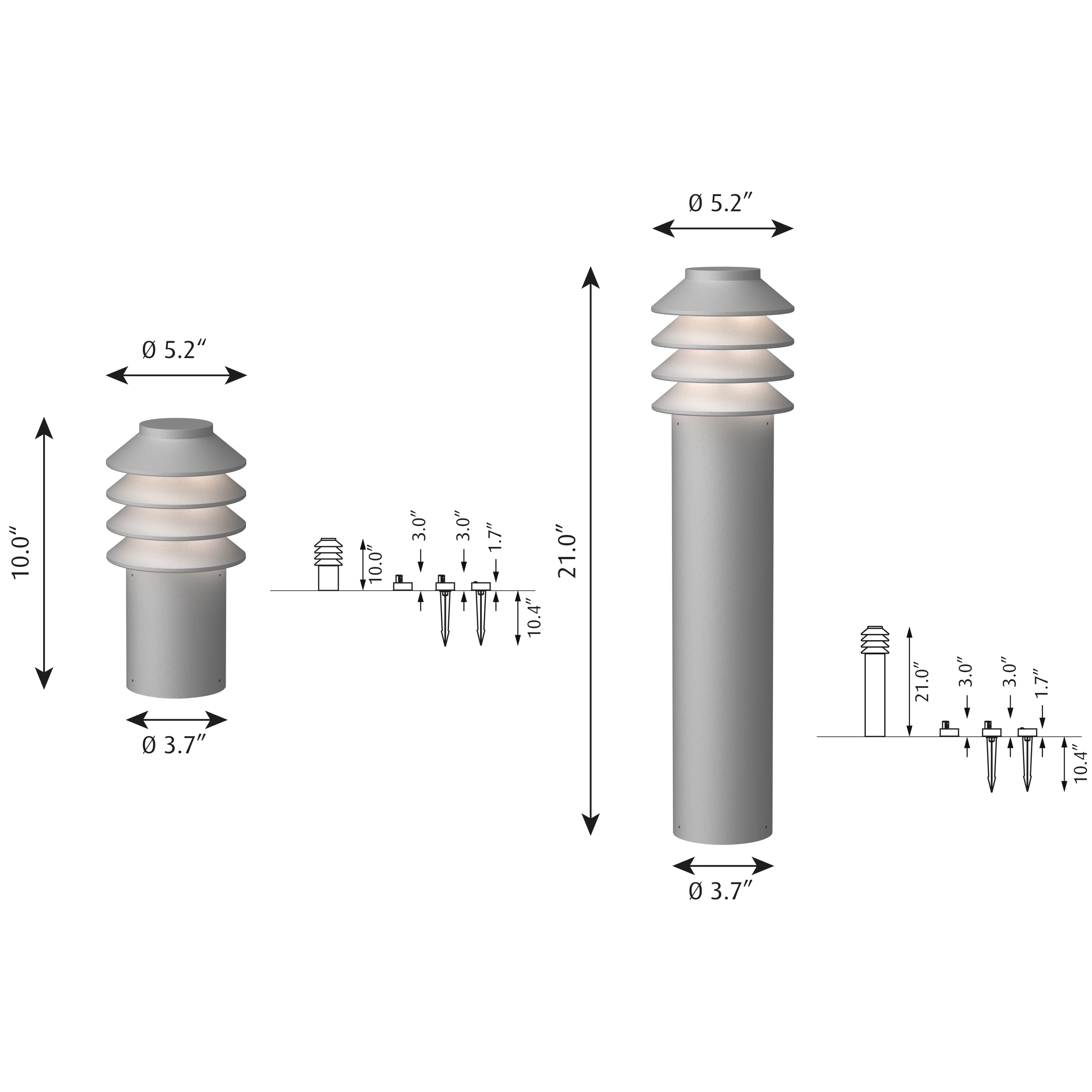 Mounting options include: Spike Mount for use in soil or gravel. Spike mount bollards come pre-wired with a weatherproof 12 inch connector cable for above-ground use. Anchor Mounts are designed for use in new concrete pads and require professional below-ground cabling. Baseplate Mounts include a baseplate for securing the bollard to existing concrete or decks and are designed for use with professional below-ground cabling. Anchor and Baseplate fixtures include inputs for professional cabling.