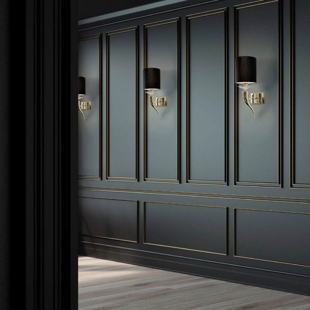 The Loving Arms W1 Single Arm wall lamp features a fabric shade with a crystal detail and beautifully curved metal detail with Matt Nickel, Chrome, White, Black, Bronze, Satin Brass or Brilliant Brass finish. Fabric shade in Black, Beige, Red, White or Brown. One 40 watt 120 volt G16.5 candelabra base incandescent bulb is required, but not included. 5.9 inches width x 17.3 inch height x 7.9 inch depth.