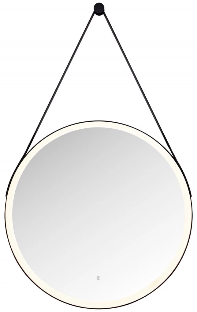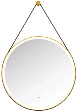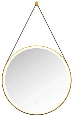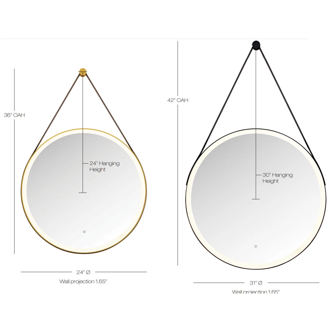 The Madeleine Illuminated Wall Mirror adds a clean unique look to your space. The lit is diffused behind the Frosted outer edge of the mirror. A leather strap holds the mirror that hangs from the wall peg. The Matte Black features a Black leather strap, and the Satin Brass features a Brown leather strap. The touch sensitive dimmer features a red indicator light when power supply is connected, blue indicator light when LED source is in use. Touch and hold to dim light source. Do not connect to a secondary dimmer.
