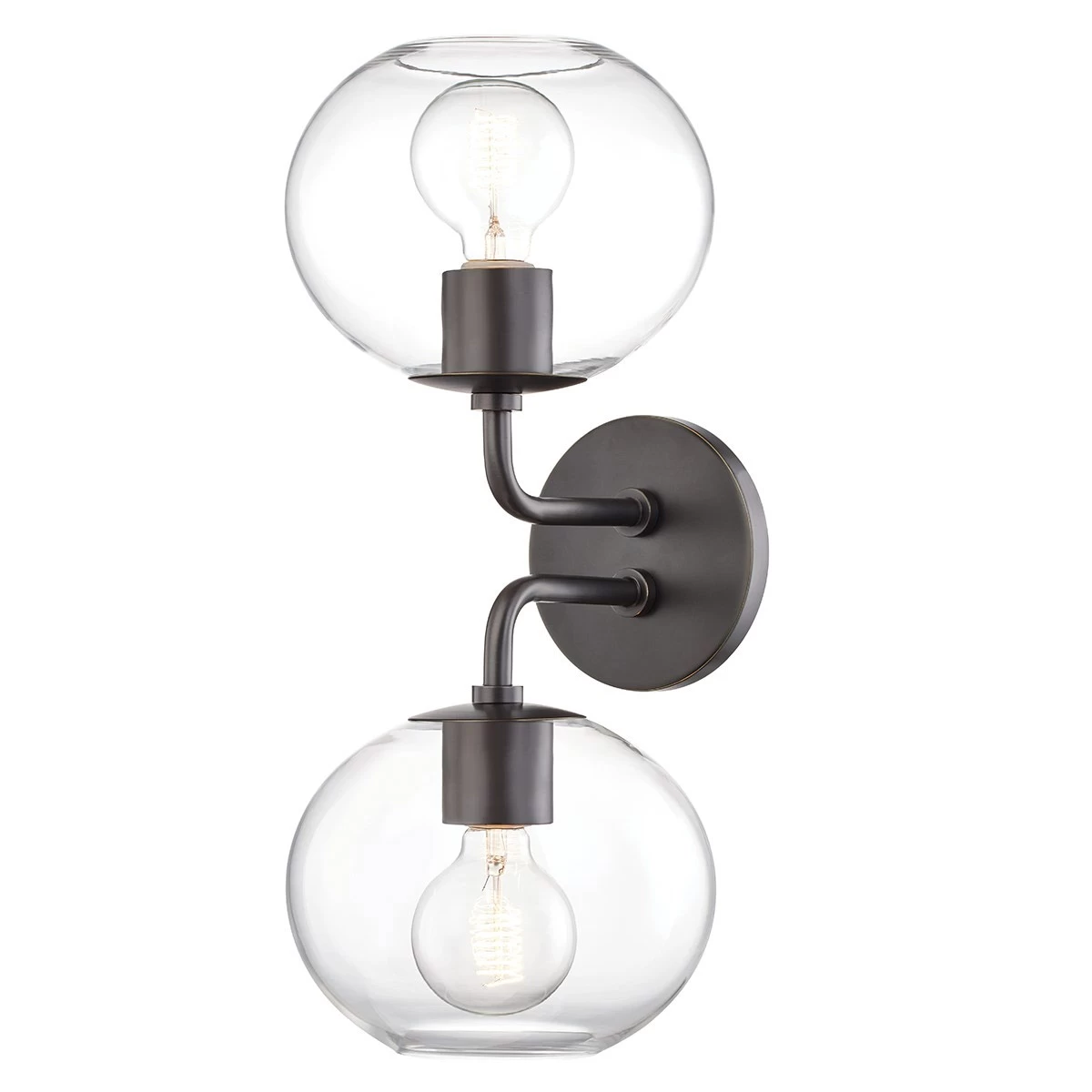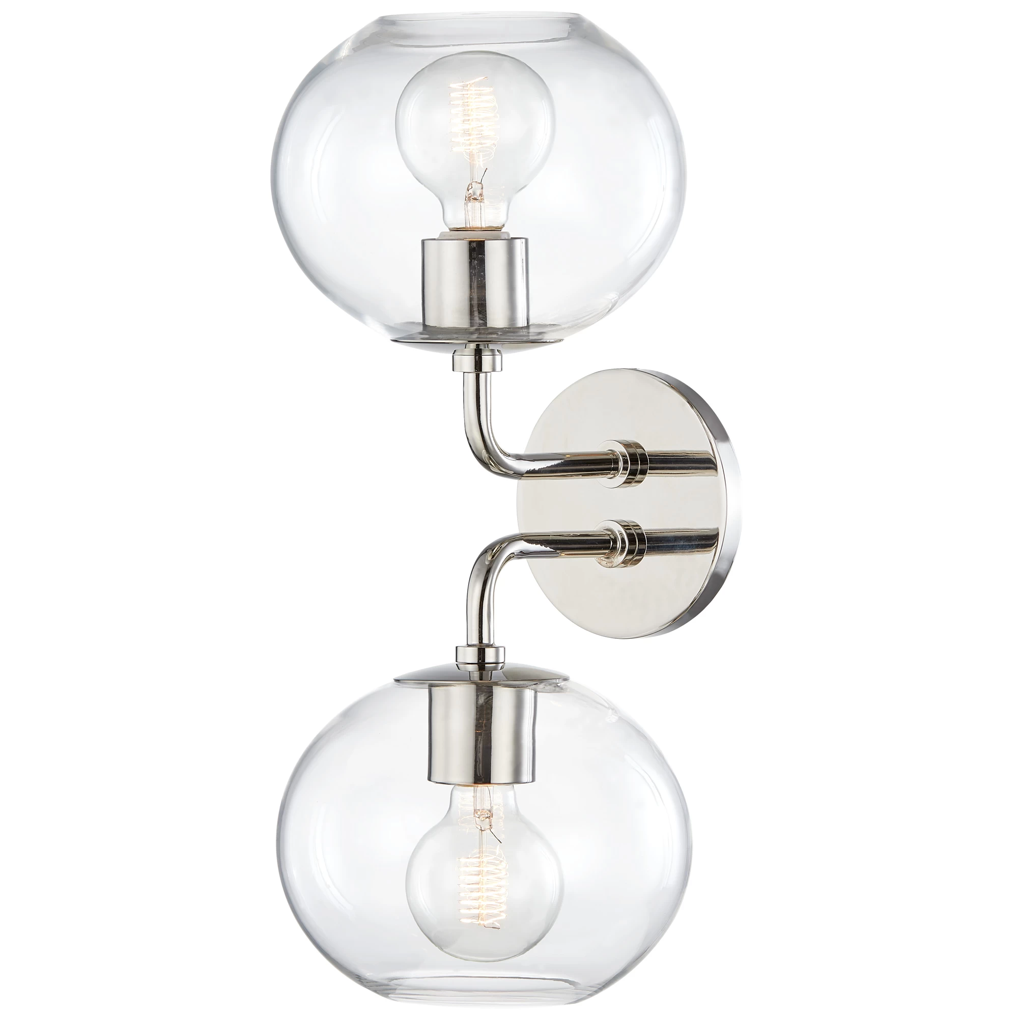 The Margot Double Wall Light offers a chic, contemporary look featuring two Clear glass globe shades extending out from a single round backplate by two curving arms. Available finished in Aged Brass, Old Bronze, or Polished Nickel. May be mounted horizontal or vertical. CE and cUL listed for damp locations.