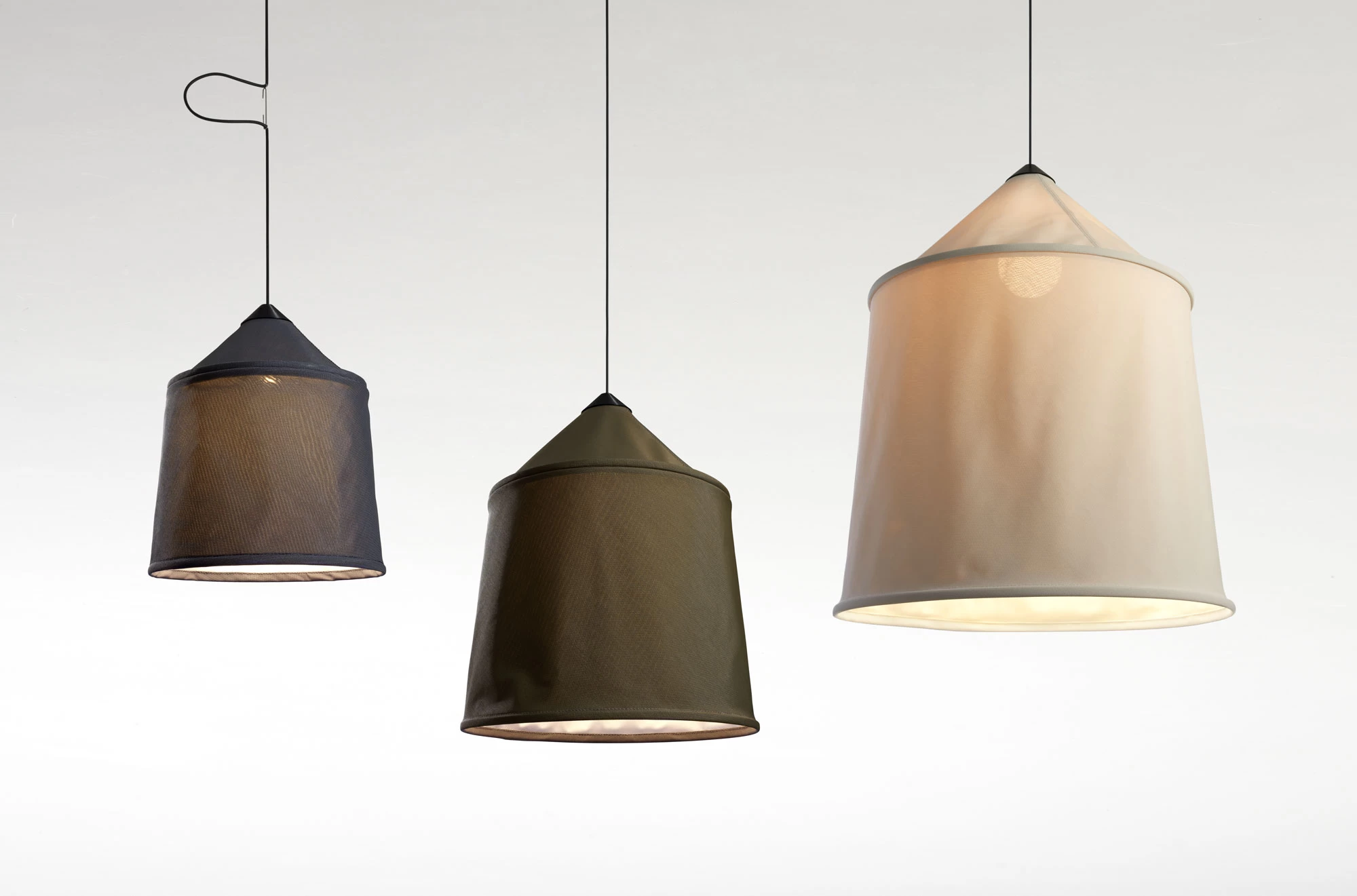 Jaima Outdoor Pendant, designed by Joan Gaspar, is inspired by the fabrics of the Bedouin tents of North Africa. The flexible ductile material, textielene, sifts light through the white inner shade as it moves. Available in Green, Blue, Beige, and Grey with a Black finish in small, medium, and large sizes. Comes with 78.74 inches of cable to customize length. UL listed. Wet location rated.