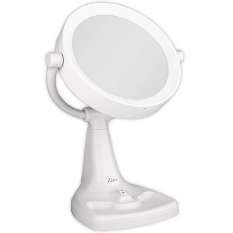 The Max Bright Sunlight Vanity Mirror offers great versatility with a dual sided mirror providing 10x or 1x magnification making makeup application a breeze. It includes a fluorescent light to ensure a clearer reflection and with its unique design may be positioned in a variety of angles for whether you are using the mirror sitting or standing. 6 foot long plug in cord.