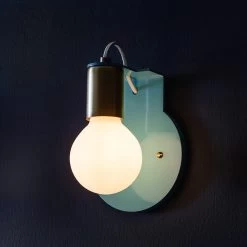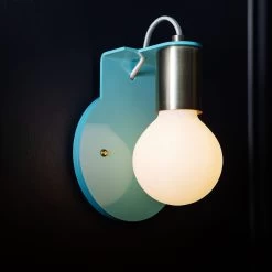 The Naked Astronaut Wall Sconce features a clean and simple design with a round backplate that has a thin piece of metal that reaches up and out to hold the single bulb. UL listed.