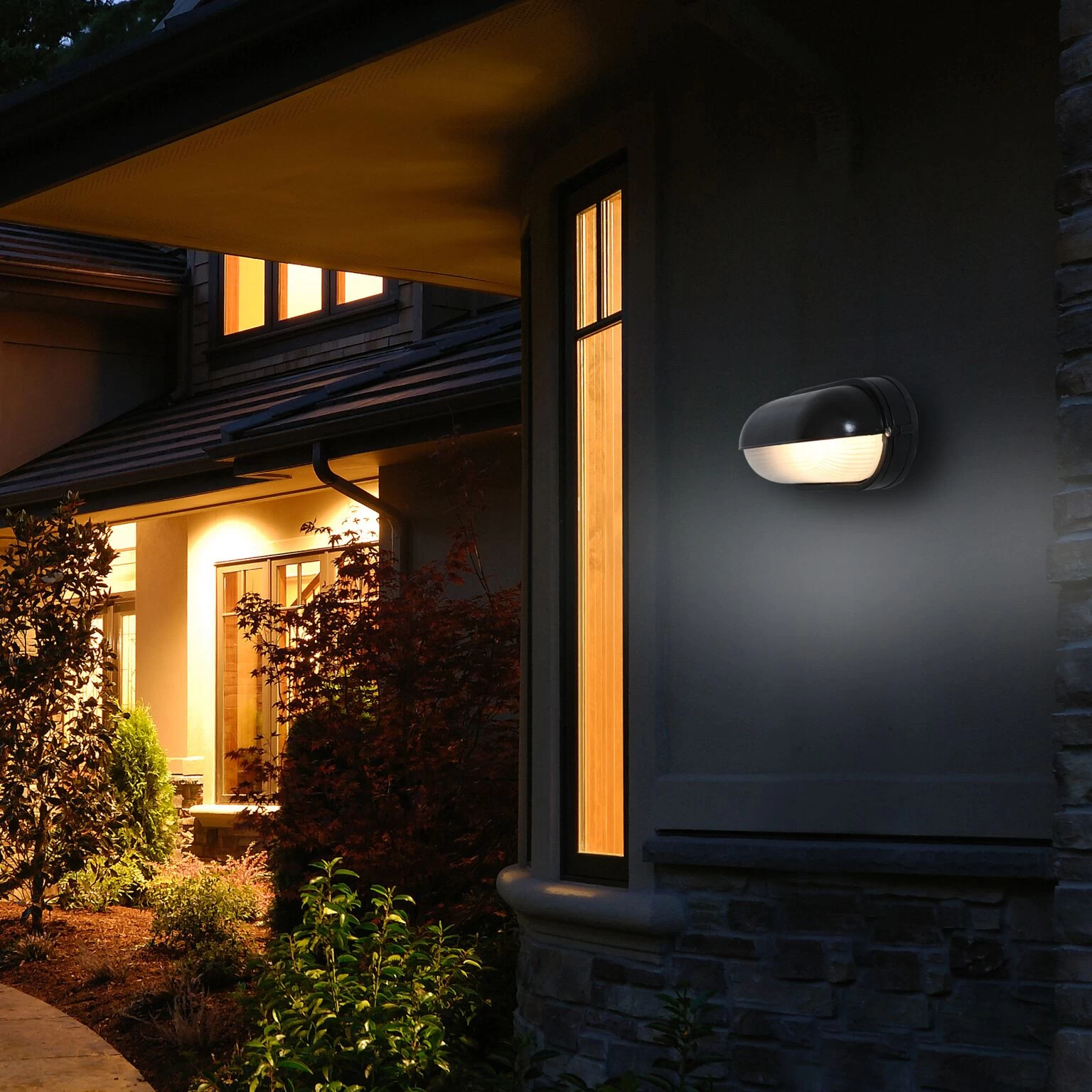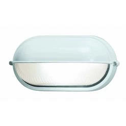 Nauticus Outdoor Oval Eyelid Wall Light features Frosted glass with a Black, Satin Nickel, or White finish. Two lamping options. 8.25 inch width x 4.25 inch height x 3.5 inch depth. UL listed for wet locations. ADA compliant.