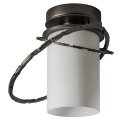 The Olympus Outdoor Semi Flush Ceiling Light adds a clean decorative look to your exterior space. Two hand hammered and stamped aluminum rings, in varying sizes, intersect and surround the cylindrical glass shade.