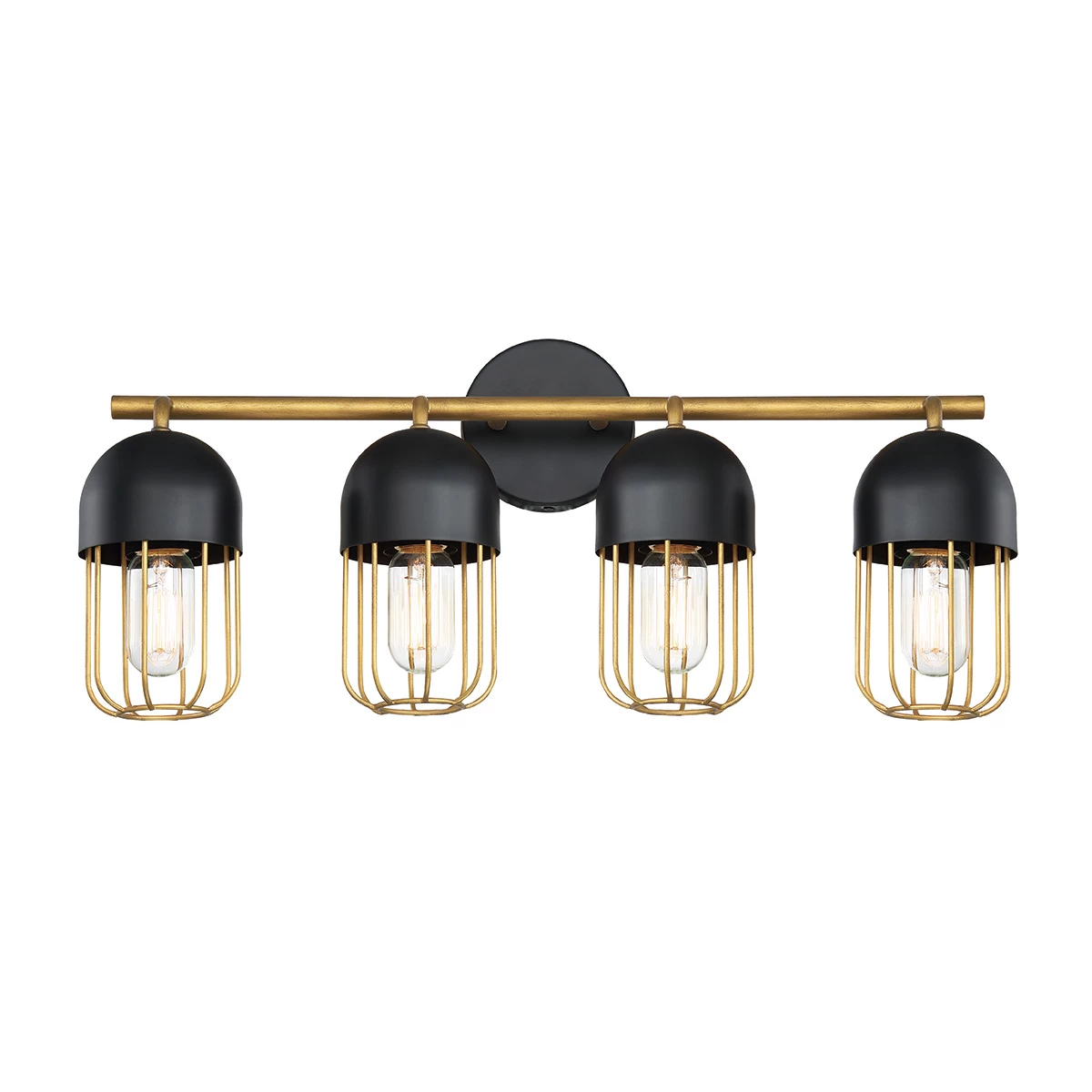 The Palmerston Bathbar offers a modern look that will tie into a number of interiors, featuring an array of Gold cage shadse set into a Black cap and backplate. Available in two sizes. ETL listed for damp locations.
