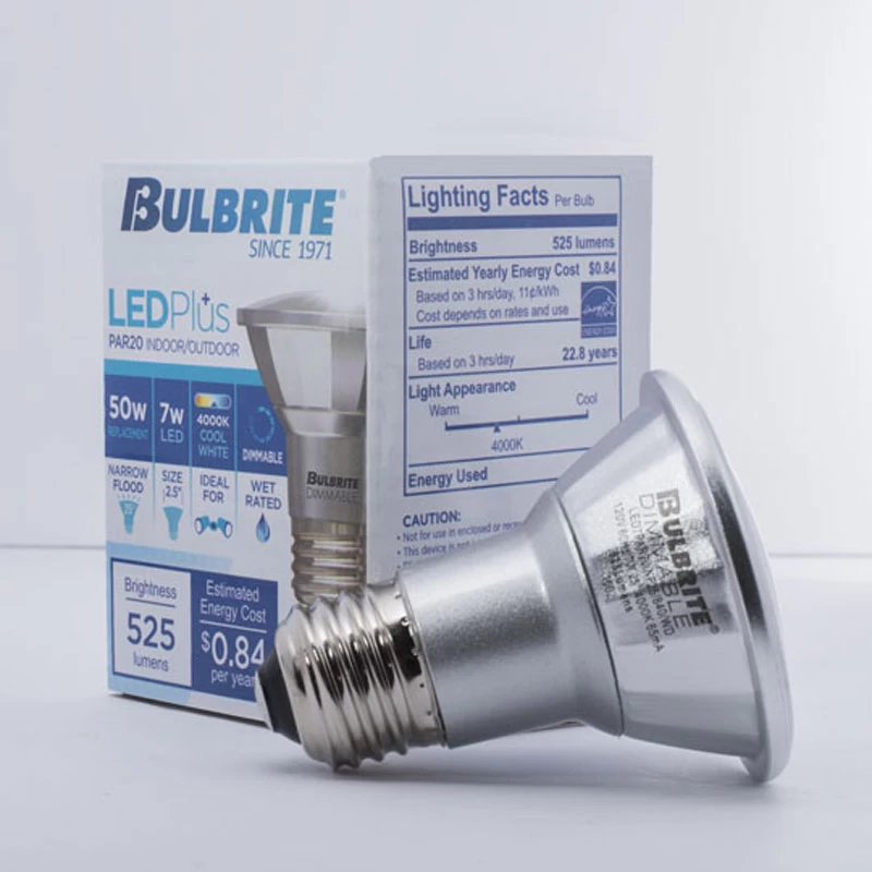 The PAR20 7 Watt Medium Base bulb features a high performance driver offering smooth dimming. Ideal for residential and commercial applications, most commonly used in recessed, track lighting, and outdoor security lighting. Equivalent to a 50 watt halogen. Compatible with a wide range of dimmer types (see attached manufacturer reference for dimmer compatibility). Sold as a 3-pack.