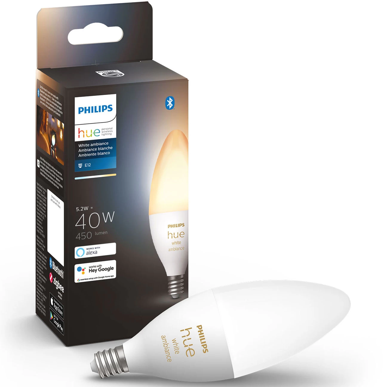 The Philips Hue E12 White Ambiance Smart Bulb features a tunable white light source (2200K-6500K) to provide the perfect ambiance for any space. Color temperature and dimming settings can be controlled from a smartphone via the Philips Hue App or with a compatible smart home speaker.