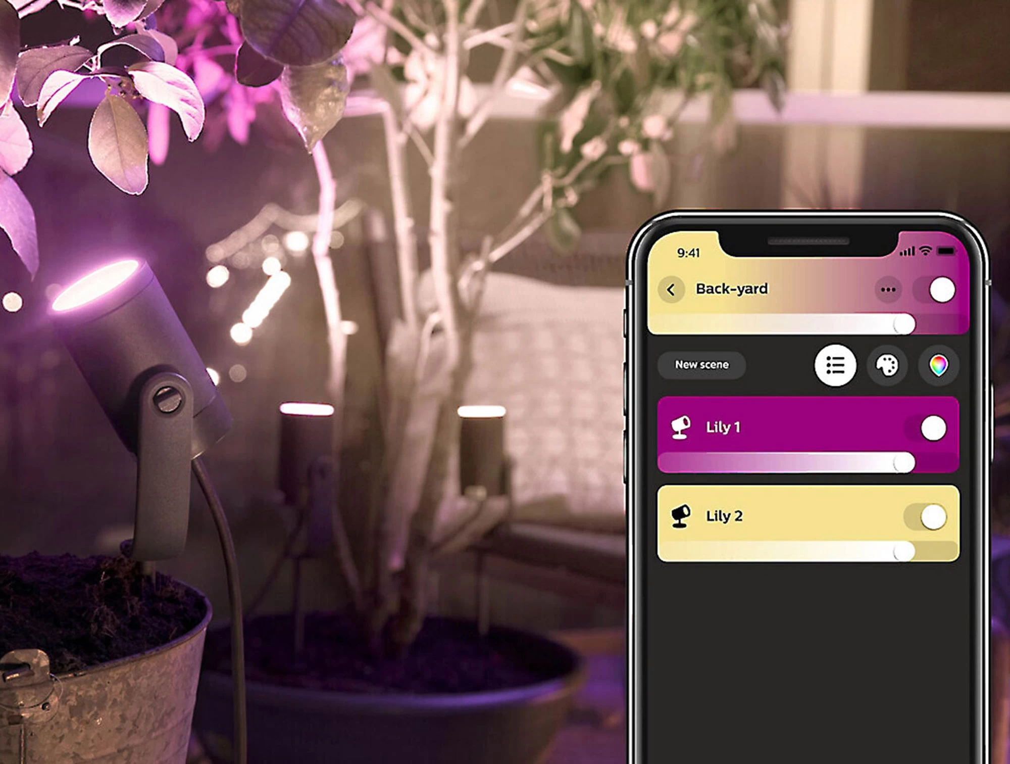 The Lily White / Color Ambiance Spot Light Extension will instantly add to your home’s ambiance and safety. Using Tunable White + RBG technology, the Lily can highlight gardens or illuminate dark walkways or entrances. This extension kit includes one light point, cables, spike, and surface mount. Can be nestled into the ground or mounted on a surface.