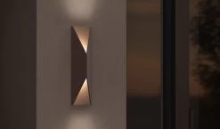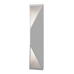 The Prisma Outdoor Wall Light offers an intriguing, modern design featuring angled cuts of triangular forms to reveal the LED-illuminated surface. Available finished in Textured White, Textured Gray, or Textured Bronze as a tall and narrow or short and wide fixture. ADA compliant. Rated for wet locations.