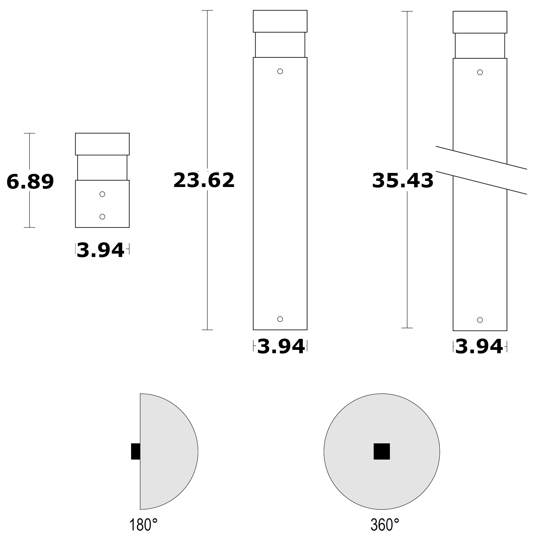 The Outdoor Bollard features aluminum alloy construction with a texturized polyester powder paint finish. Offered in three height options. Designed to illuminate avenues, walkways, pathways, gardens and parks without glare. Available in a 180 degree symmetric beam emission option with an opal polycarbonate diffuser, or 360 degree symmetric beam emission option with a clear polycarbonate diffuser. Integral 120 volt, 8 watt LED module, 3000K or 4000K color temperature. IP65 rated for wet locations. CE listed.