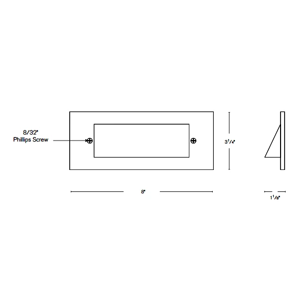 RBS-LG Outdoor Recessed Wall/Step Light Faceplate is made of solid brass with etched finishes in Verde, Gun Metal, Rusty, Matte Bronze, Moss, Black or Aged Brass. ETL listed. ADA compliant. Listed for wet locations. Housing required, sold separately. 8 inch width x 3.25 inch height x 1.1 inch depth.