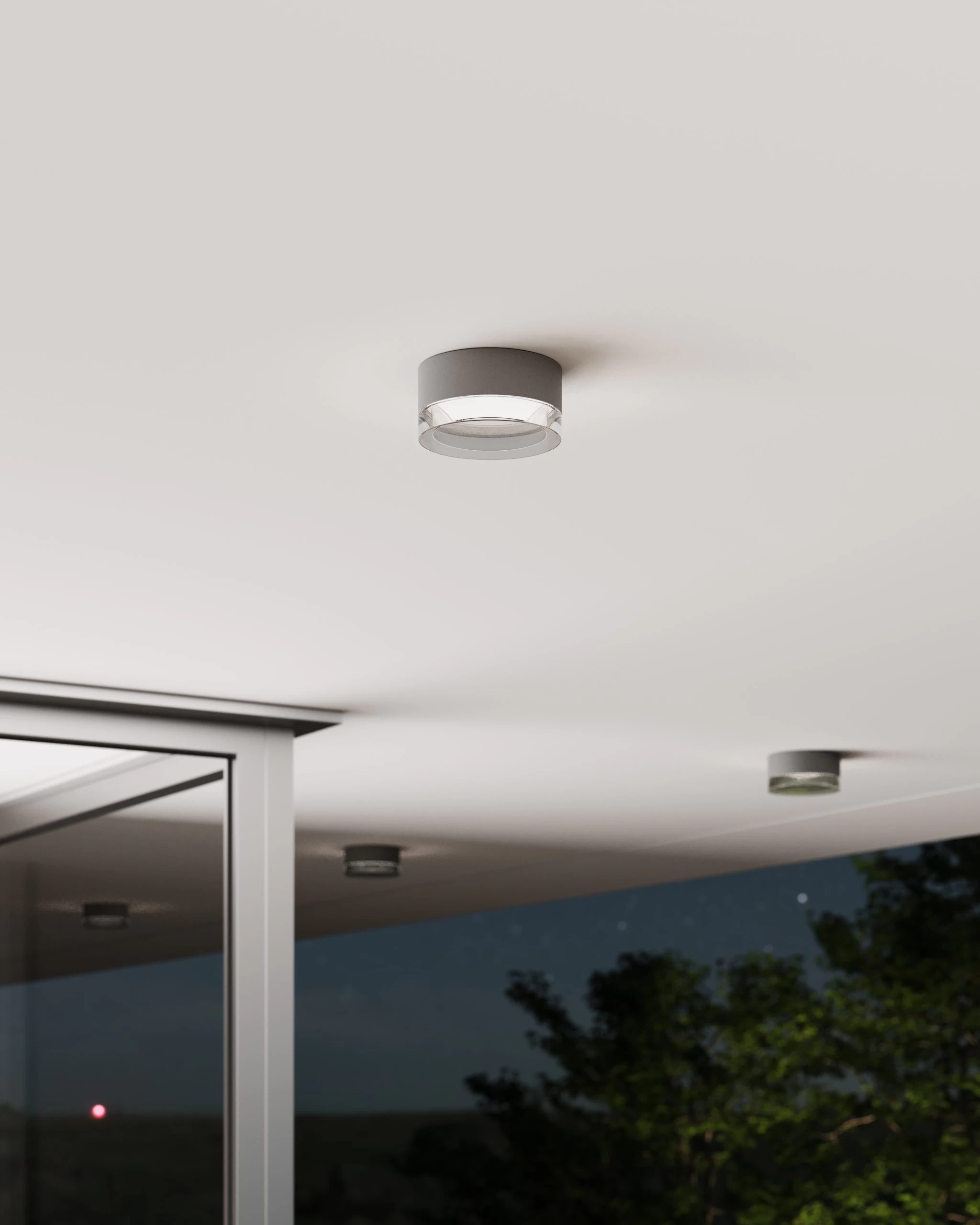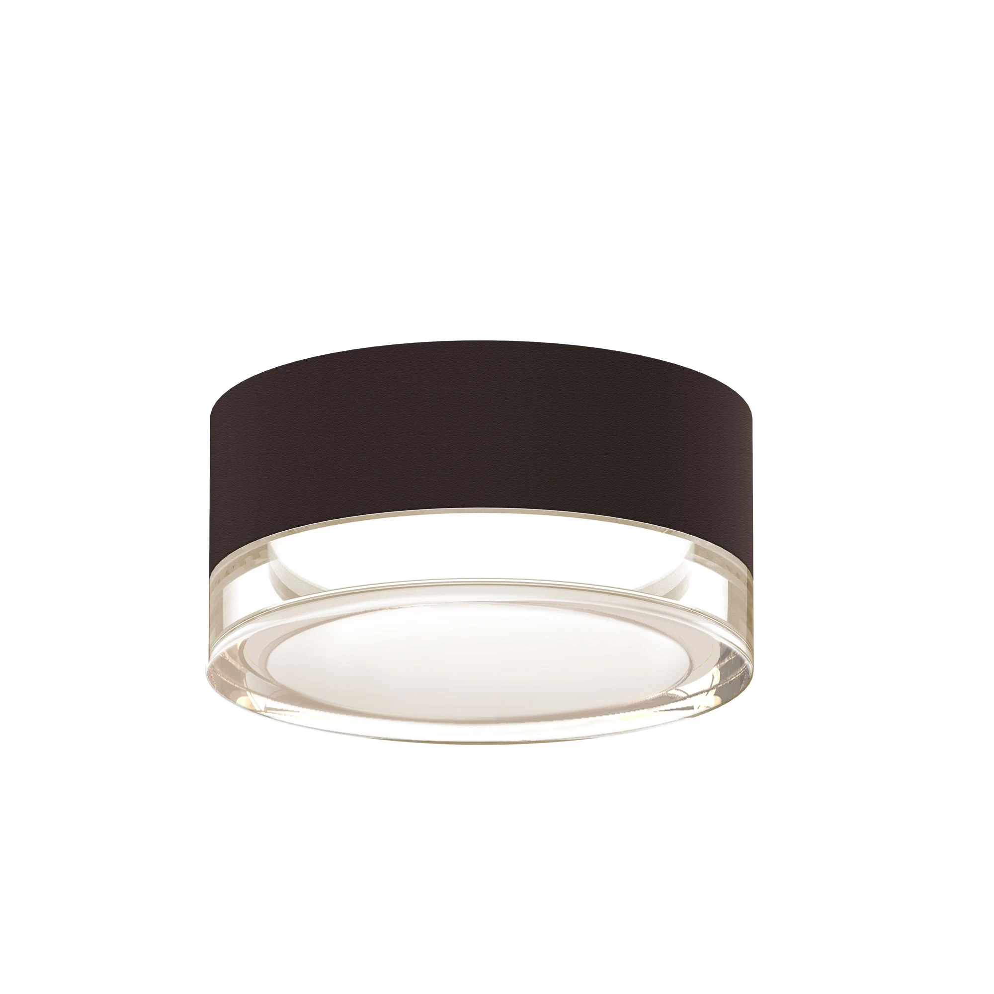 Reals PL Outdoor Ceiling Flush Light is a solidly built compact light perfect for any outdoor space. Features a Clear acrylic or White polycarbonate diffuser with a Textured Grey, Textured Bronze, or Textured White finish. One 10 watt LED module is included. Not dimmable. ETL listed. Damp location rated. 5 inch width x 2.5 inch height.
