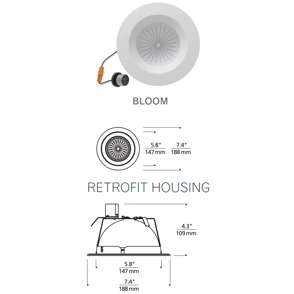 The Reflections 120V 6 Inch Bloom Retrofit Flanged Indirect Downlight infuses design with style and taste to become an architectural component. Upgrades most incandescent 6 inch recessed downlights with a medium base (E26) socket. Bloom is molded with embossed design details and brings the geometry of the natural world into harmony with traditional, transitional, or contemporary room decor. Dome acts as a reflector to a completely hidden ring of LEDs delivering indirect illumination. Includes retrofit housing. Dimmable with an electronic low voltage or TRIAC dimmer, sold separately.
