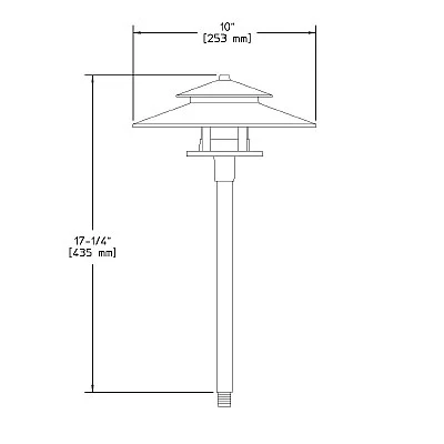 RL4 12 Volt Aluminum Path Light is fabricated from die cast aluminum with extruded aluminum stem. .50 inch NPS male threads to screw onto mounting accessories, sold separately. Includes S7 mounting stake. Optional junction boxes available, but not required for low voltage fixtures. Thermoset polyester powdercoat finish in Bronze, Black or Verde. Frosted tempered glass lens. Spun aluminum reflector with white thermoset powdercoat. One 20 watt 12 volt JC G4 halogen lamp is included with fixture. Pre-wired with 3 foot pigtail of 18-2 AWG wire. Includes low voltage quick connector LVC3 for easy hook up to the low voltage supply cable not included. 10 inch width x 17.25 inch height. ETL listed for wet locations. Required remote transformer sold separately.