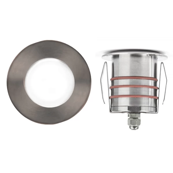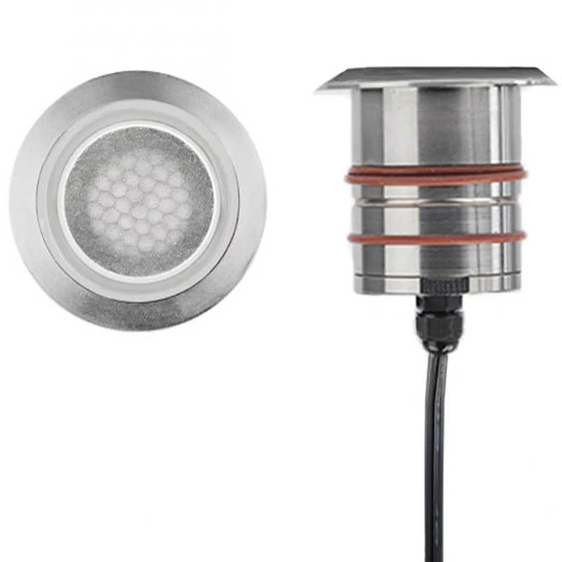 Round 2 inch In Ground Light is suitable for up, down, and side light applications. Available with a Stainless Steel or Bronzed Stainless Steel finish with a plain Frosted glass diffuser or with an integrated Honeycomb louver to prevent glare. Includes spring clip, 6 foot lead wire, and direct burial gel-filled wire nuts. Maintains constant lumen output against voltage drop. 9-15VAC; low-voltage magnetic transformer required, sold separately. Integrated 4.1 watt 12 volt LED module. 70,000 hour rated life. 2.75 inch diameter x 3.13 inch height. UL listed. IP68 rated: suitable for continuous immersion in water.