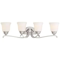 Savannah Row Bathroom Vanity Light features Etched Opal shades with Brushed Nickel metal in a scrollwork design. Available in 1, 2, 3, and 4 light options. 100 watt 120 volt A19 medium base bulbs are required, but not included. 1 Light: 7.25 inch width x 9.254 inch height x 5.5 inch depth. 2 Light: 18 inch width x 8.25 inch height x 7 inch depth. 3 Light: 22.75 inch width x 8.25 inch height x 8.25 inch depth. 4 Light: 31 inch width x 8.25 inch height x 8.25 inch depth. damp location rated. ETL listed.
