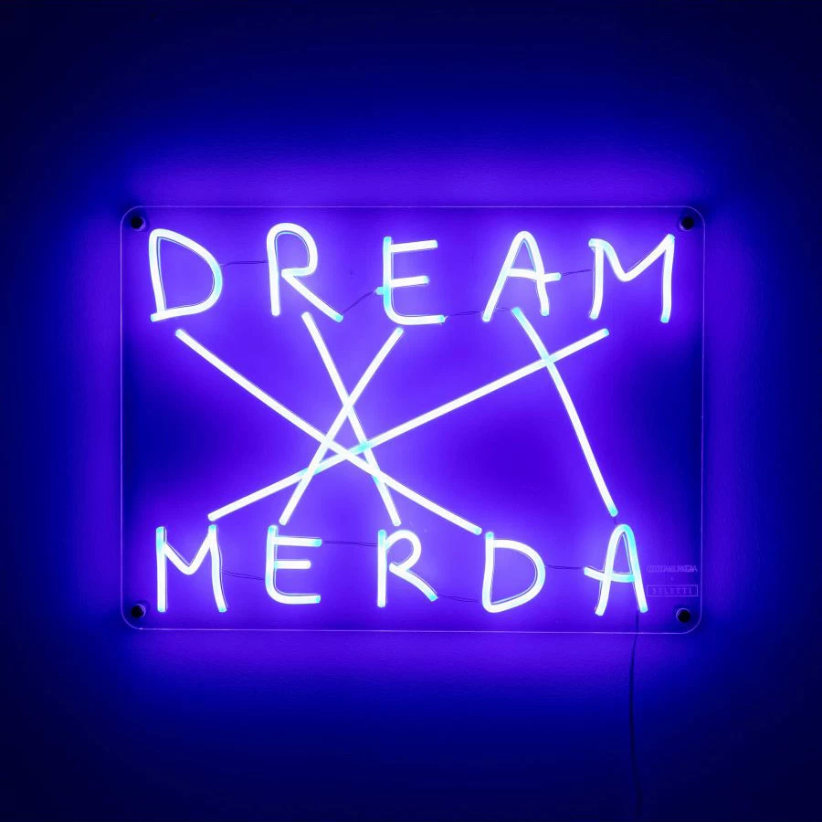 The Dream Merda Plug-in Wall Sconce adds a bold art deco look to your interior space. The clear acrylic backplate has painted LED letters, perfect in your room.