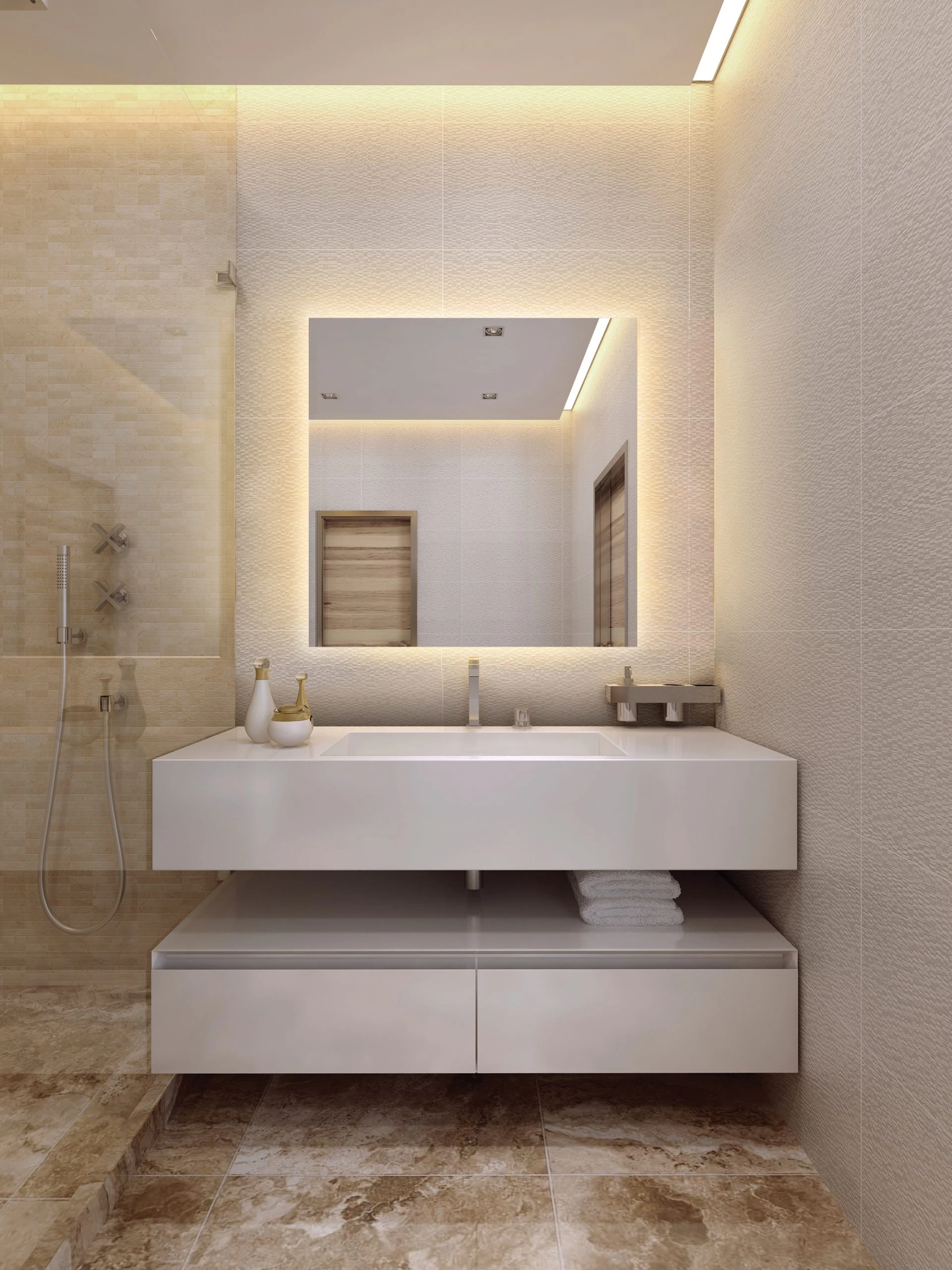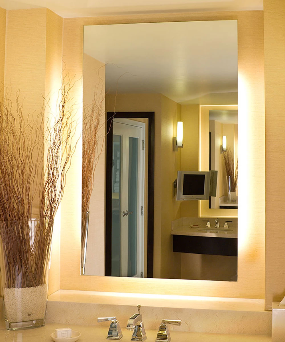 The Serenity Lighted Mirror features ambient light that appears to be glowing from within the wall. Diffusers provided a finished side view. Corrosion resistant DuraMirror glass. Available in four sizes. Forward-phase dimming technology.