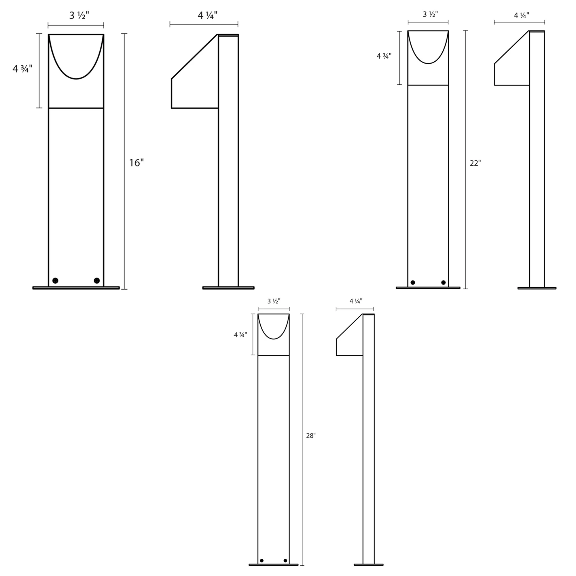 Shear Outdoor Bollard adds definition and architectural interest to outdoor sites and along paths or planted beds. Available with Textured Grey or Textured Bronze finishes in small, medium, and large sizes. One 9 watt, 12 volt MR16 GU5.3 base LED bulb is included. Non dimmable. 12VAC power supply is required, and sold separately. ETL listed. Wet location rated. Small: 3.5 inch width x 16 inch height. Medium: 3.5 inch width x 22 inch height. Large: 3.5 inch width x 28 inch height.
