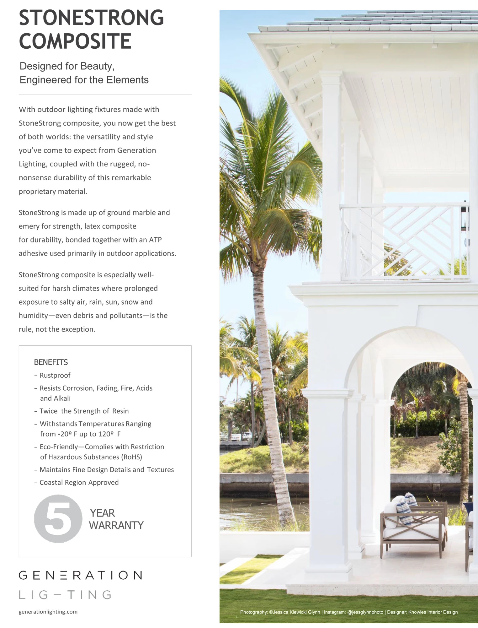 The Shepherd Outdoor Ceiling Flush Mount features a Dark Weathered Zinc finish with Clear Seeded glass. Made of StoneStrong, a proprietary composition for outstanding durability, even in the harshest elements. ETL listed. Suitable for damp locations.
