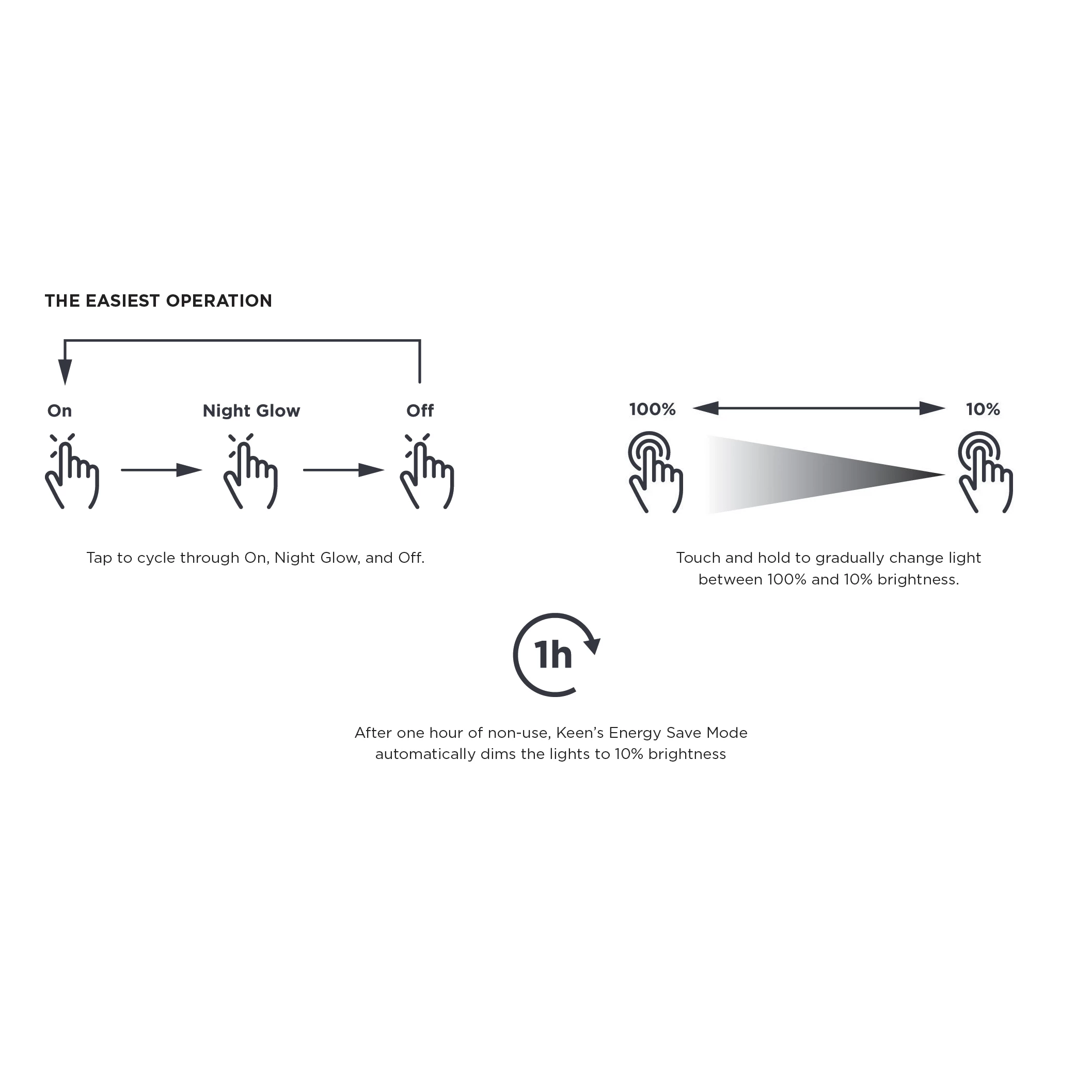 Keen touch control features Tap-to-Cycle through On, Night Glow and Off. Hold to dim down to 10%. After one hour of non-use, Energy Save Mode automatically dims lights to 10%.
