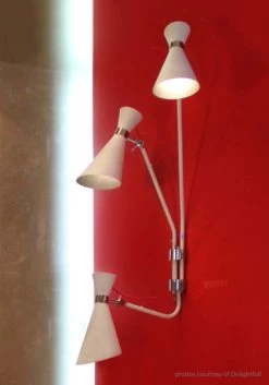 Simone Wall Sconce features Glossy White with a red wire and Nickel Plated finish is a fresh lighting fixture with a strong attention to detail. Three 40 watt, 120 volt A19 type Medium base incandescent bulbs are required, but not included. 18 Inch width x 46 inch height x 18 inch depth.