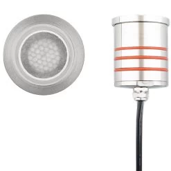 Slim Round 2 inch In Ground Light is suitable for soft ground applications. Available with a Stainless Steel or Bronzed Stainless Steel finish and a plain Frosted diffuser or with an integrated Honeycomb louver to reduce glare. Solid stainless steel construction. Includes 6 foot lead wire and direct burial gel-filled wire nuts. Maintains constant lumen output against voltage drop. Integrated 4.1 watt 12 volt LED module. 9-15VAC; low-voltage magnetic required, sold separately. 2.1 inch diameter x 3.13 inch height. UL listed. IP68 rated: suitable for constant immersion in water.