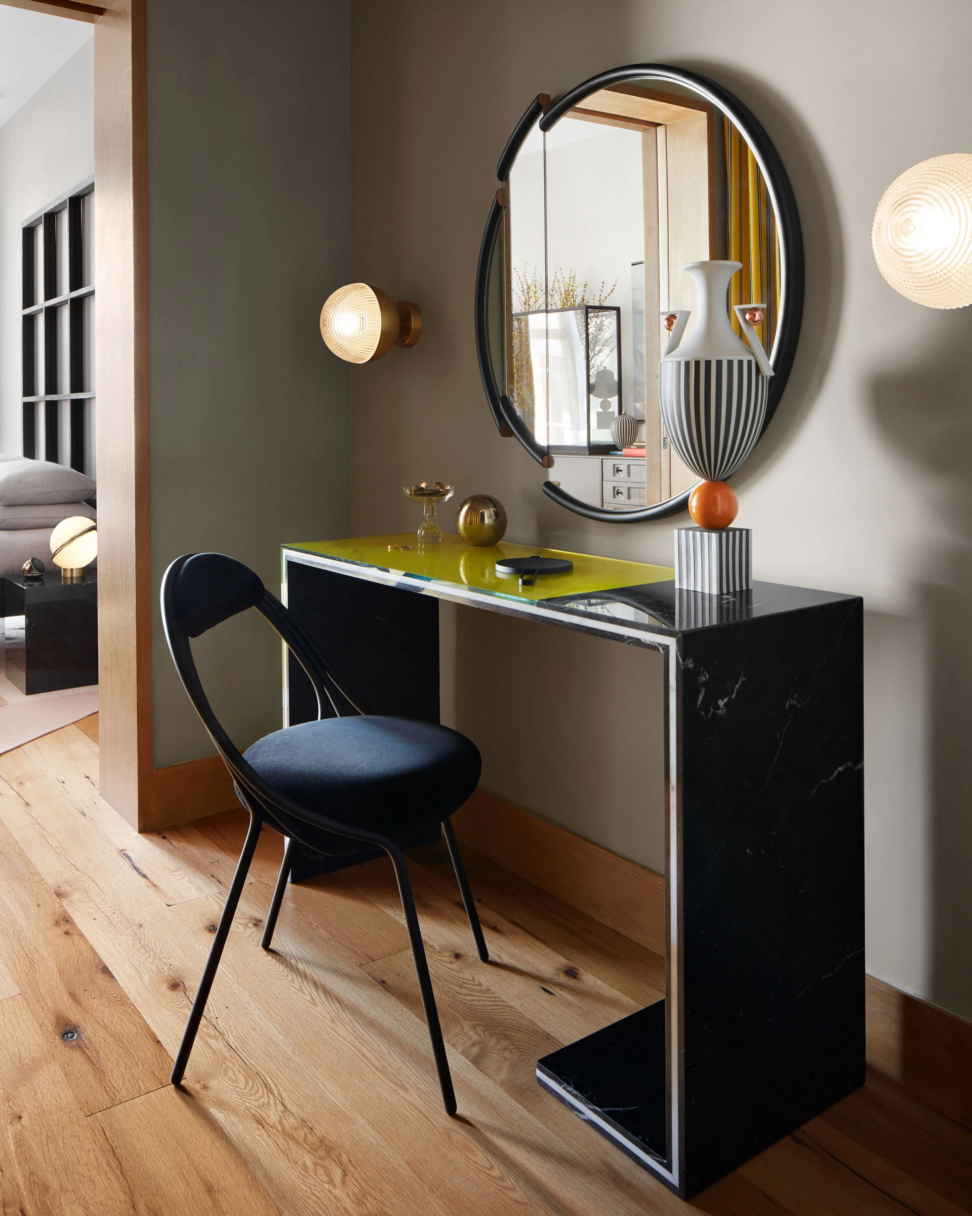 Split Round Mirror, designed by Lee Broom, features a precision cut slice, shifted from its original position to reveal an oak trimmed section of the Black frame. This unique piece is perfect for any area. ADA compliant. 35.43 inch width x 35.82 inch height x 1.58 inch depth.