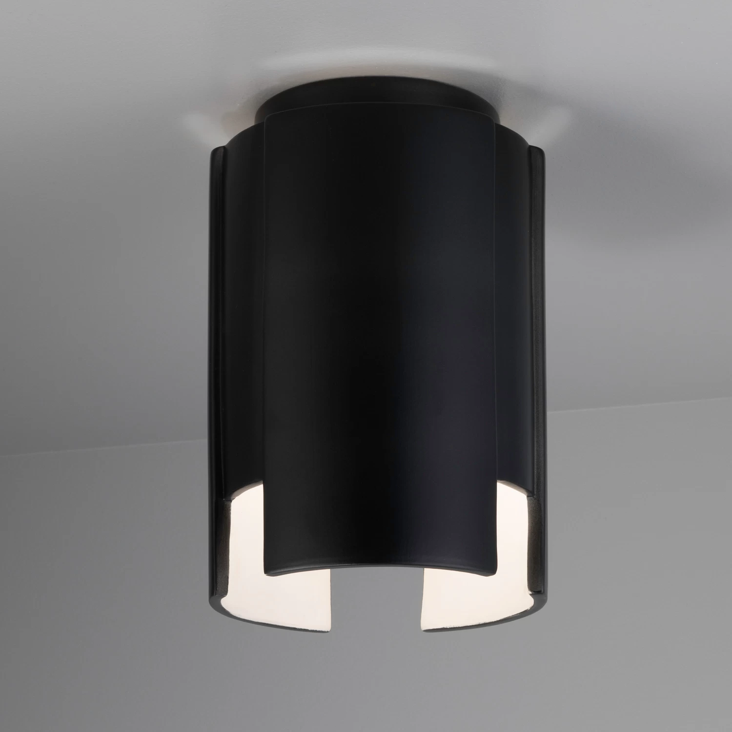 The Stagger Outdoor Ceiling Flush Light brings a clean detailed look to a variety of exterior spaces. The cylindrical shade looks to have staggered panels and is lined to reflect the light. Available in Bisque, Carbon, Concrete, Matte White or Greco Travertine with Incandescent or integrated LED lamping options. Bisque option is in its natural form and can be painted to your desired color. Wet location rated. Made in the USA. UL listed. NOTE: No Greco Travertine with integrated LED lamping option.