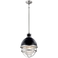 The Tollis Outdoor Pendant is a fresh take on nautical style, with its uniquely styled dome hood and contrasting thick metal cage. The Black dome is paired with a Brushed Nickel cage and stem . The clear ribbed glass adds visual texture and creates just the right amount of lighting to set the tone for a relaxing outdoor area. Suitable for covered outdoor spaces.