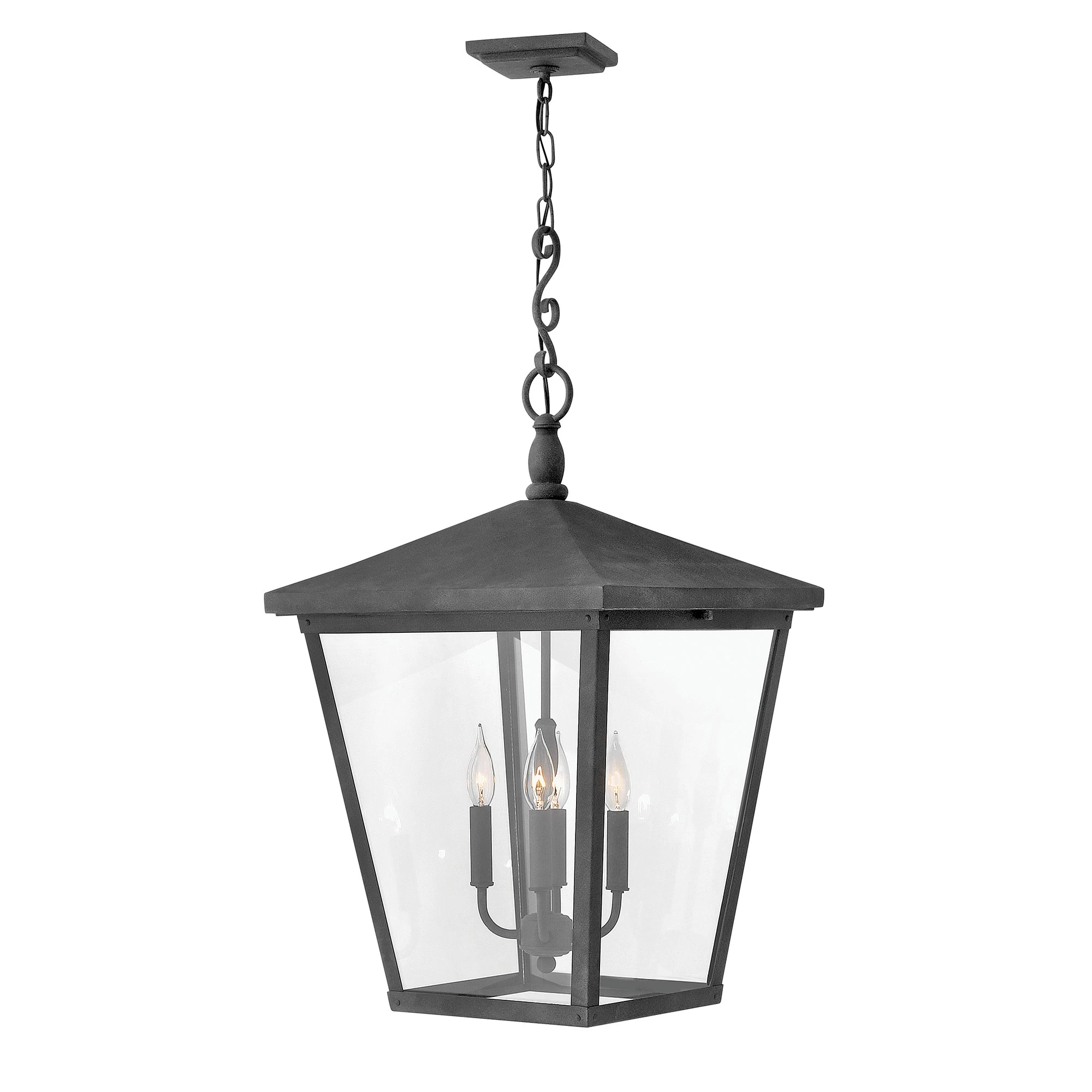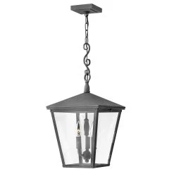 The Trellis Outdoor Pendant features a Regency Bronze finish with Clear Seedy glass or an Aged Zinc finish with Clear glass. Available in two sizes with two lamping options.