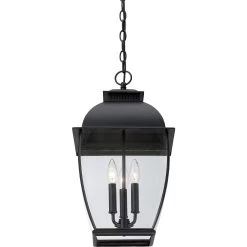 Trumbull Outdoor Pendant is inspired by the rich outdoors with its Clear Seedy glass and Mystic Black finish. Three 60 watt 120 volt B10 candelabra base bulbs are required, but not included. ETL listed for damp locations. 8.5 inch width x 18 inch height x 96 inch length.