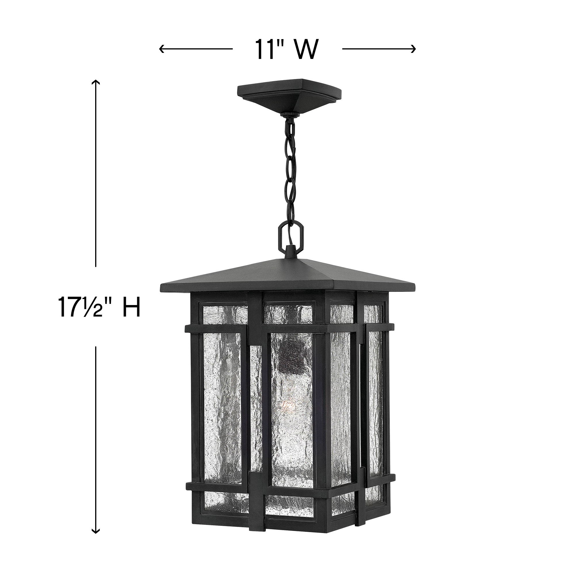 The Tucker Outdoor Pendant features an Oil Rubbed Bronze or Museum Black finish with Clear Seedy glass. One 100 watt max 120 volt medium base bulb is required, but not included. 11 inch width x 17.5 inch height x 77.5 inch maximum length. 60 inch chain included. UL listed for damp locations.