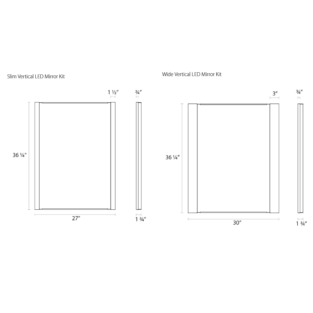 Vanity Vertical Mirror Kit offers a complete LED vanity solution. Offered in a Slim (1.5 inch) and Wide (3 inch) frame profile. Included are: Two LED Bath Bars in White optical acrylic with a Polished Chrome finish, a high quality glass mirror with safety backing, and low profile mirror mounting channels. Two 120 volt LED modules are included. Dimmable with an electronic low voltage dimmer, sold separately. UL listed. ADA compliant. Damp Location rated.