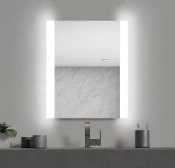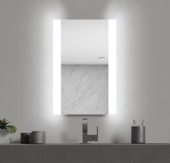 The Veda Lighted Mirror features 2.6 inch frosted glass edges on either side of the mirror. Available in two sizes. Mounts Vertically. ETL listed. Damp Location. Title 24 compliant.