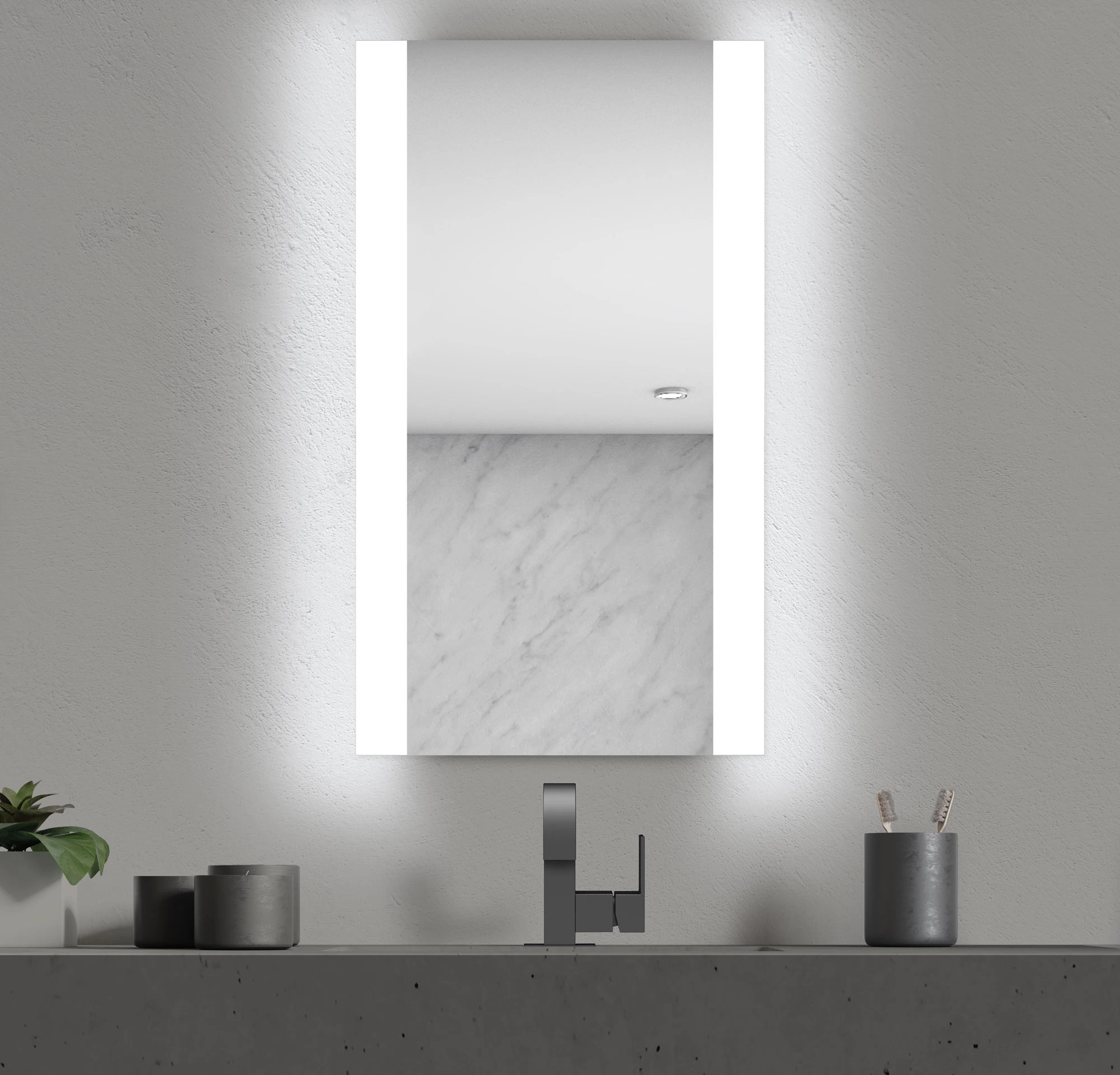 The Veda Lighted Mirror features 2.6 inch frosted glass edges on either side of the mirror, casting a beautiful glow on the wall and increases the amount of usable vanity lighting. Mounted Vertically. ETL listed. Damp Location. Title 24 compliant.