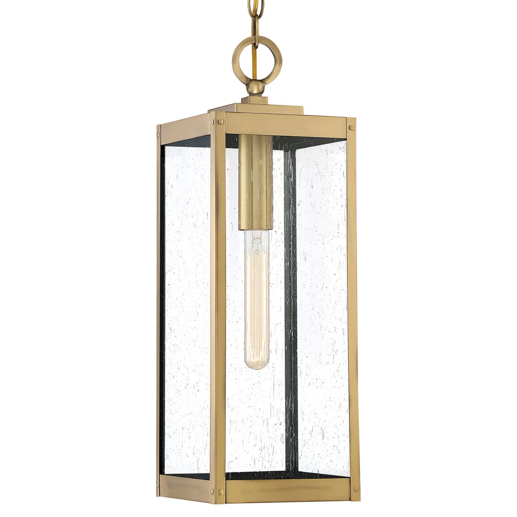 Westover Outdoor Pendant has clean lines and hand-riveted accents making this a modern industrialist’s dream. Long rectangular framework with clear seedy glass panels provide an unobstructed view of the lantern’s sleek interior. An earth black with clear glass or antique brass with clear seedy glass further enhances the versatility of this refined piece. Comes with 8 feet of chain to customize length. Damp location rated. ETL listed.