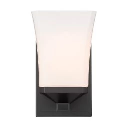 The Darcy Wall Sconce adds a warm inviting aura to your interior space. The smooth steel frame is complemented by a flared glass shade, casting warm shadows across your room. May be mounted up or down.