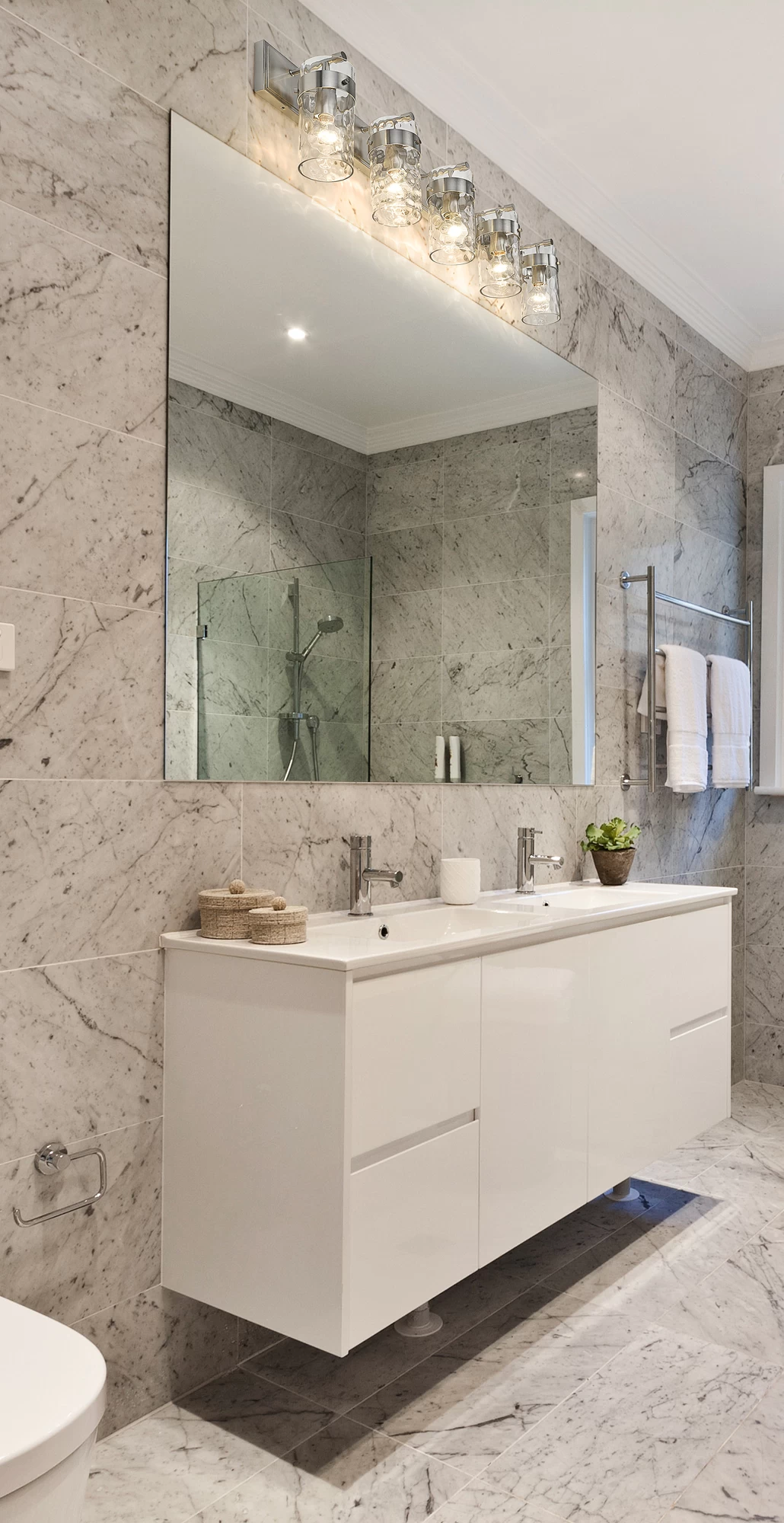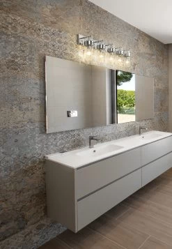 The Fontaine Bathroom Vanity Light adds a simple decorative glam to your interior space. The smooth steel frame is complemented with cylindrical glass shades, that are rippled for a romantic effect, casting warm shadows across your room.