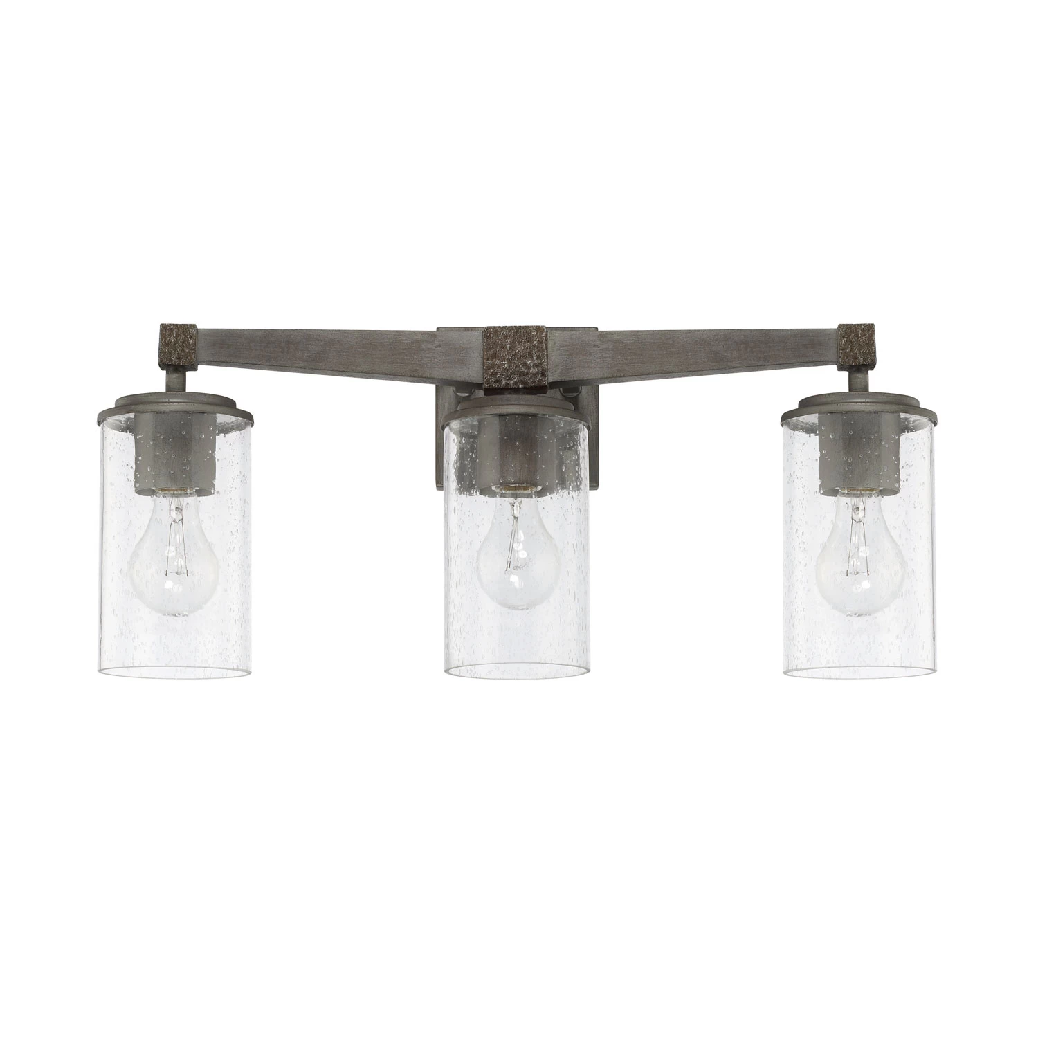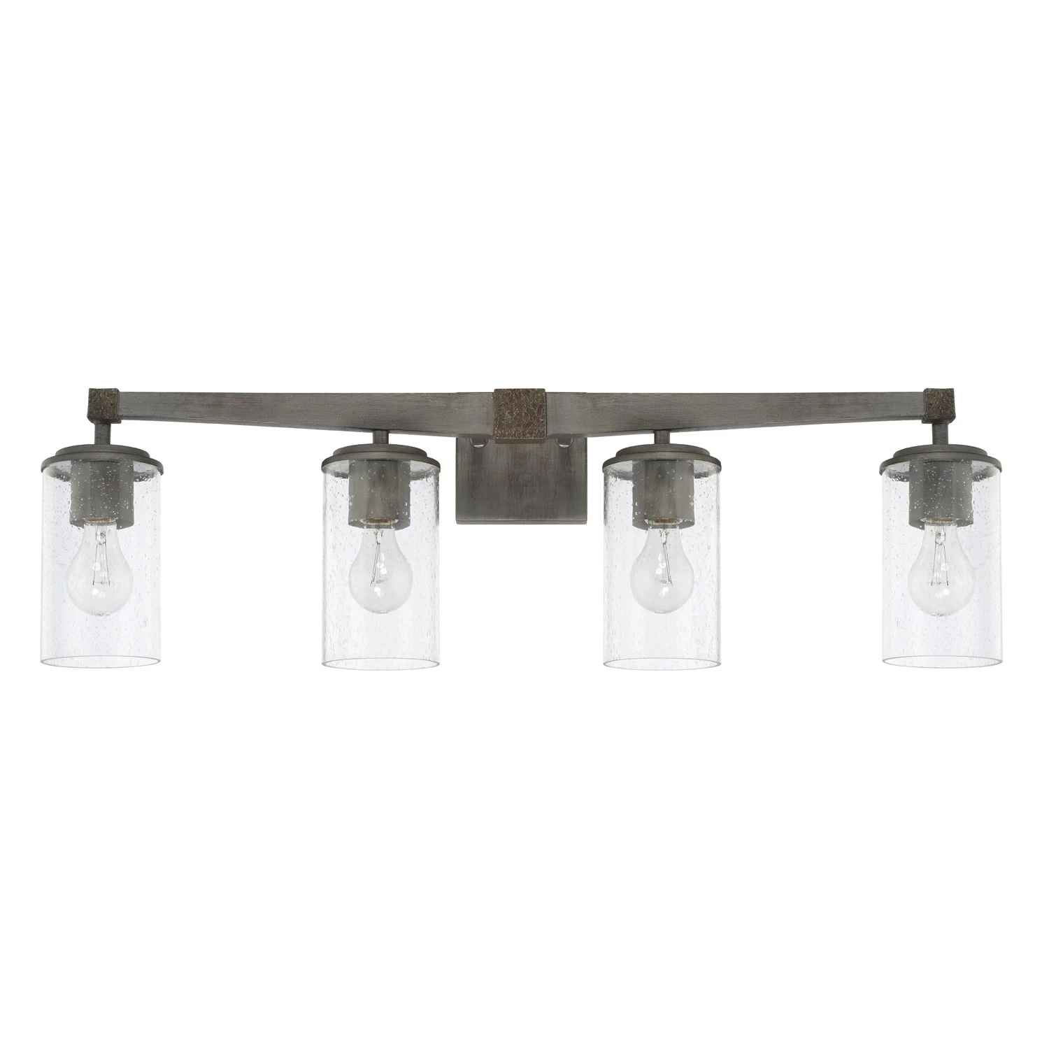 The Zac Bathroom Vanity Light has a design that will work with contemporary, industrial or farmhouse styling. Features a two-tone Urban Grey finish with Clear Seeded glass diffusers. Available with two, three or four lights. Backplate: 8 inch width x 4.75 inch height x 1 inch depth. UL listed. Suitable for damp locations.